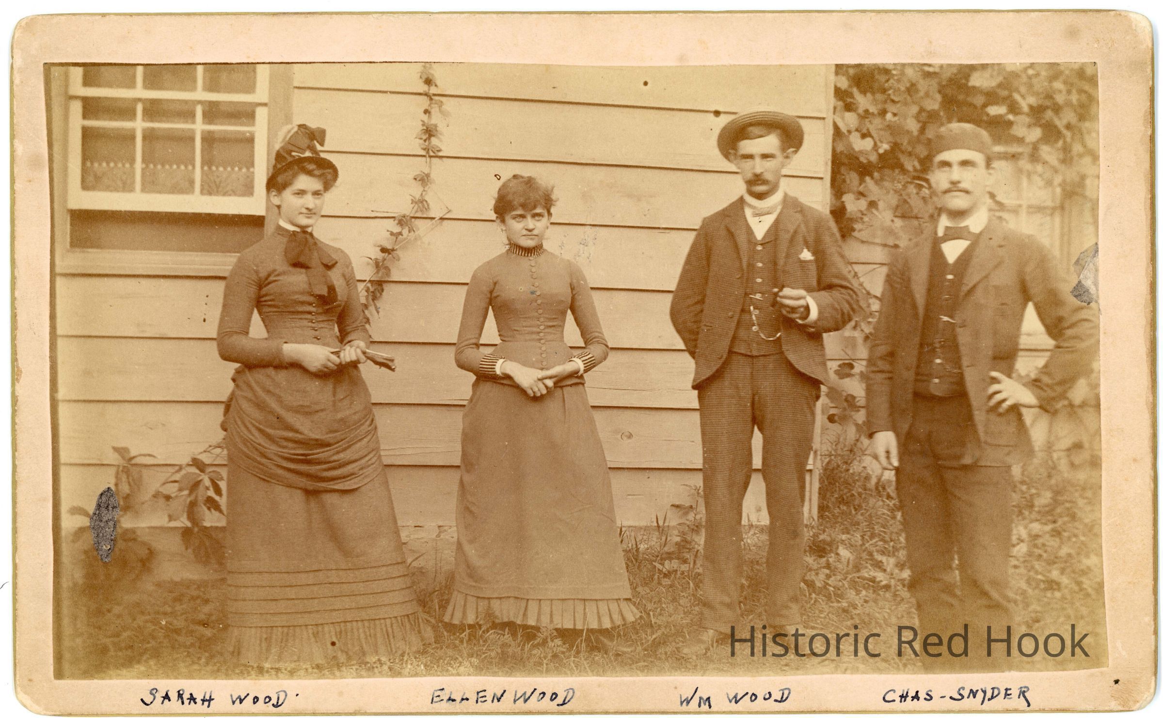 Four people posing in front of house - Sarah Wood, Ellen Wood, Wm Wood and Charles Snyder, c 1880's.Collection