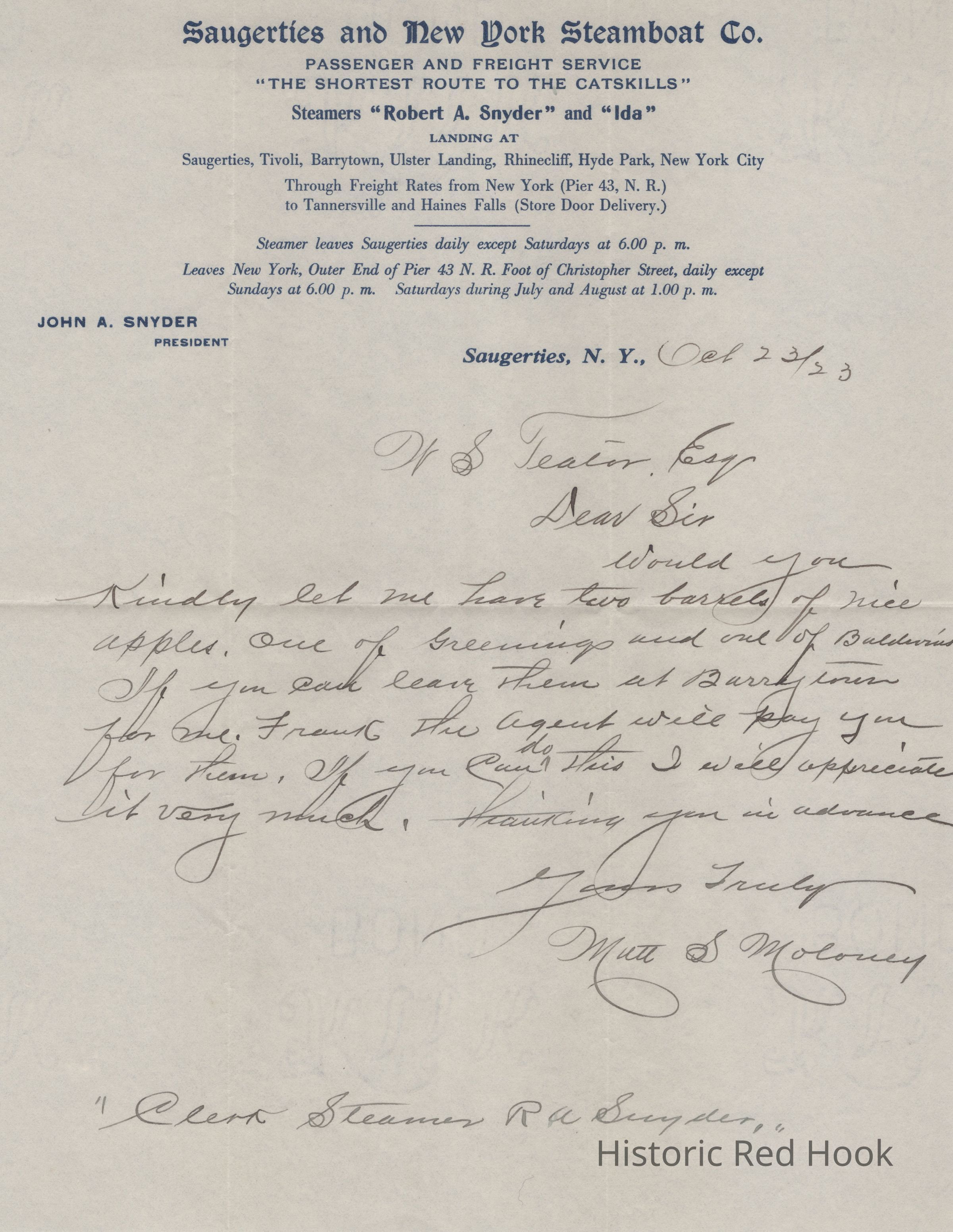 Note from Matt Moloney, clerk of the R. A. Snyder steamer of the Saugerties and New York Steamboat Co., dated October 23, 1923 to William S. Teator requesting a barrel of 'Greenings' and one of 'Baldwins' (types of apples) to be left at the dock at Barrytown where Frank the agent would pay him for them.Relationships