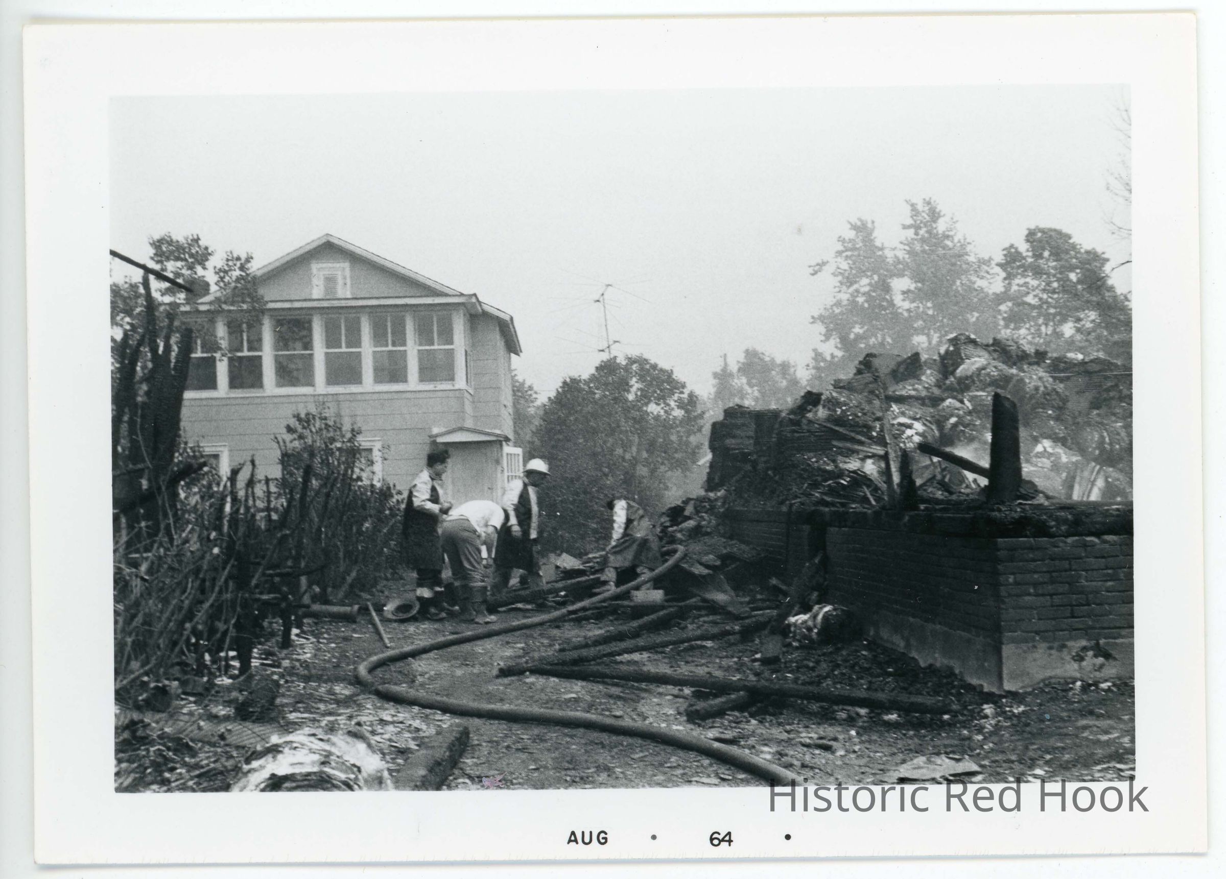 Scheffler Building fire. Image of people leaning over fire hoses next to smoldering building.Date on photo "Aug 64"Collection
