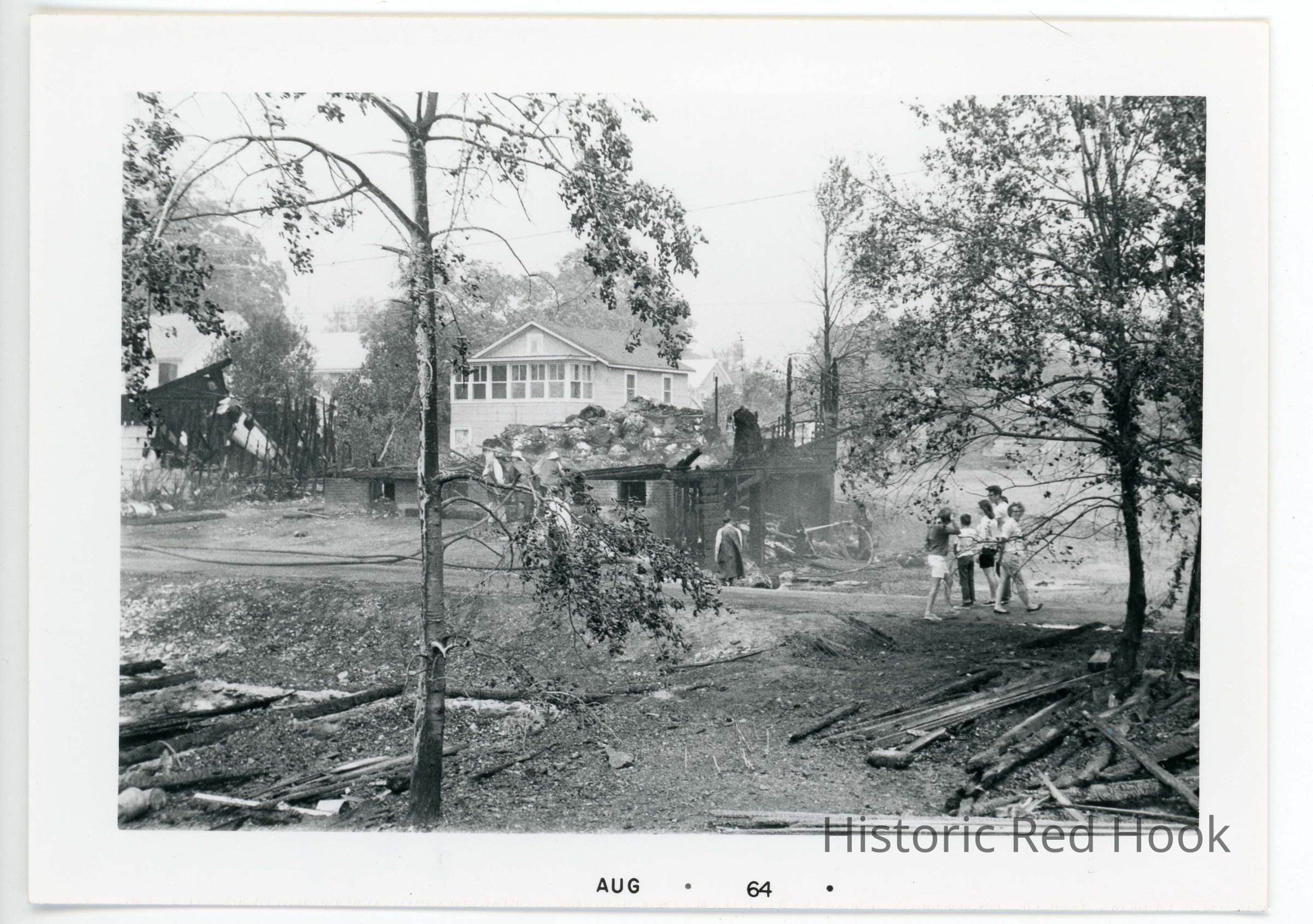 Scheffler Building fire. Image of people walking on the road in front of smoldering building.Date on photo "Aug 64"Collection