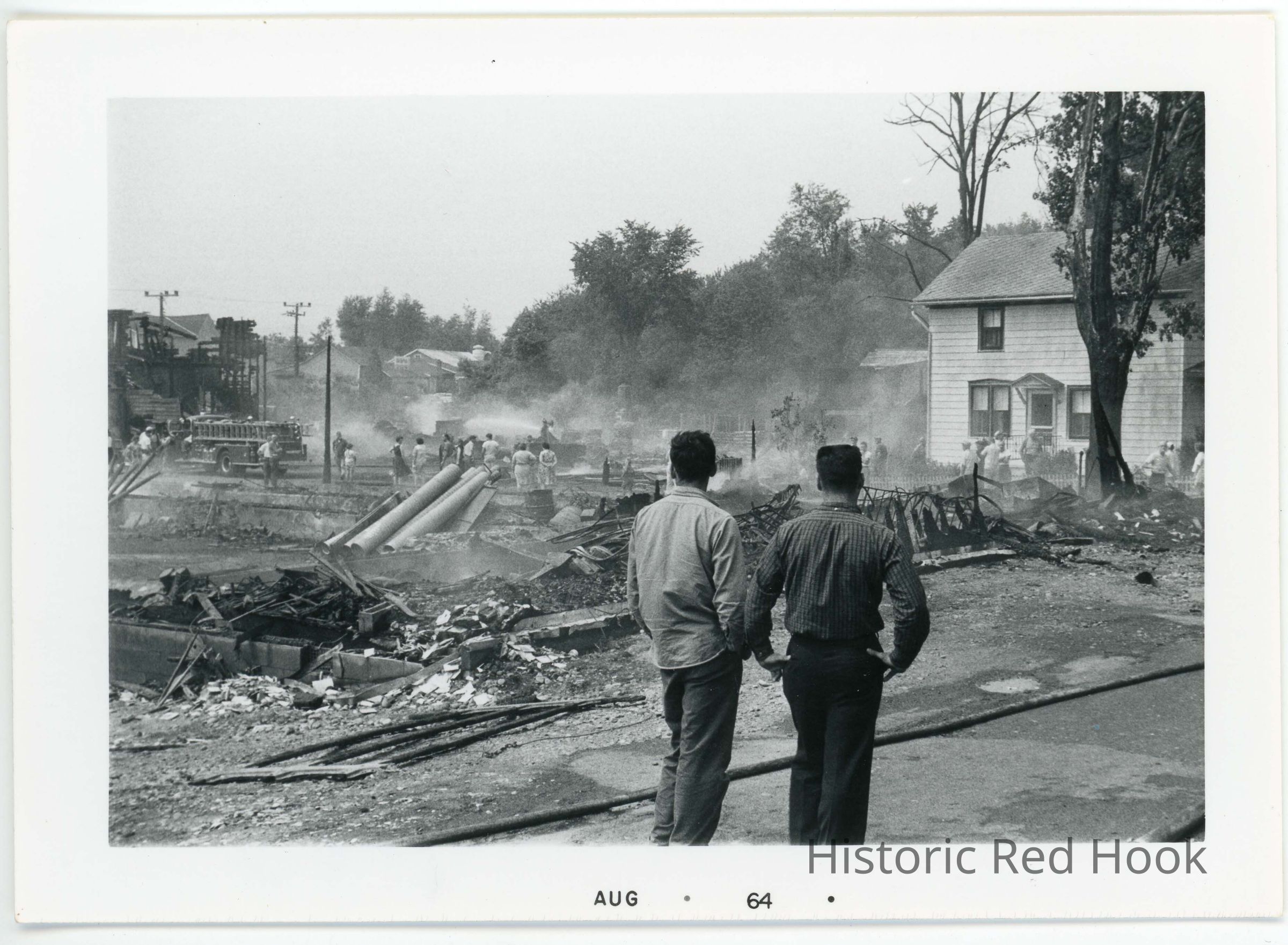 Scheffler Building fire. Image of fire smoldering in the distance, two men watching. Date on photo "Aug 64"Collection