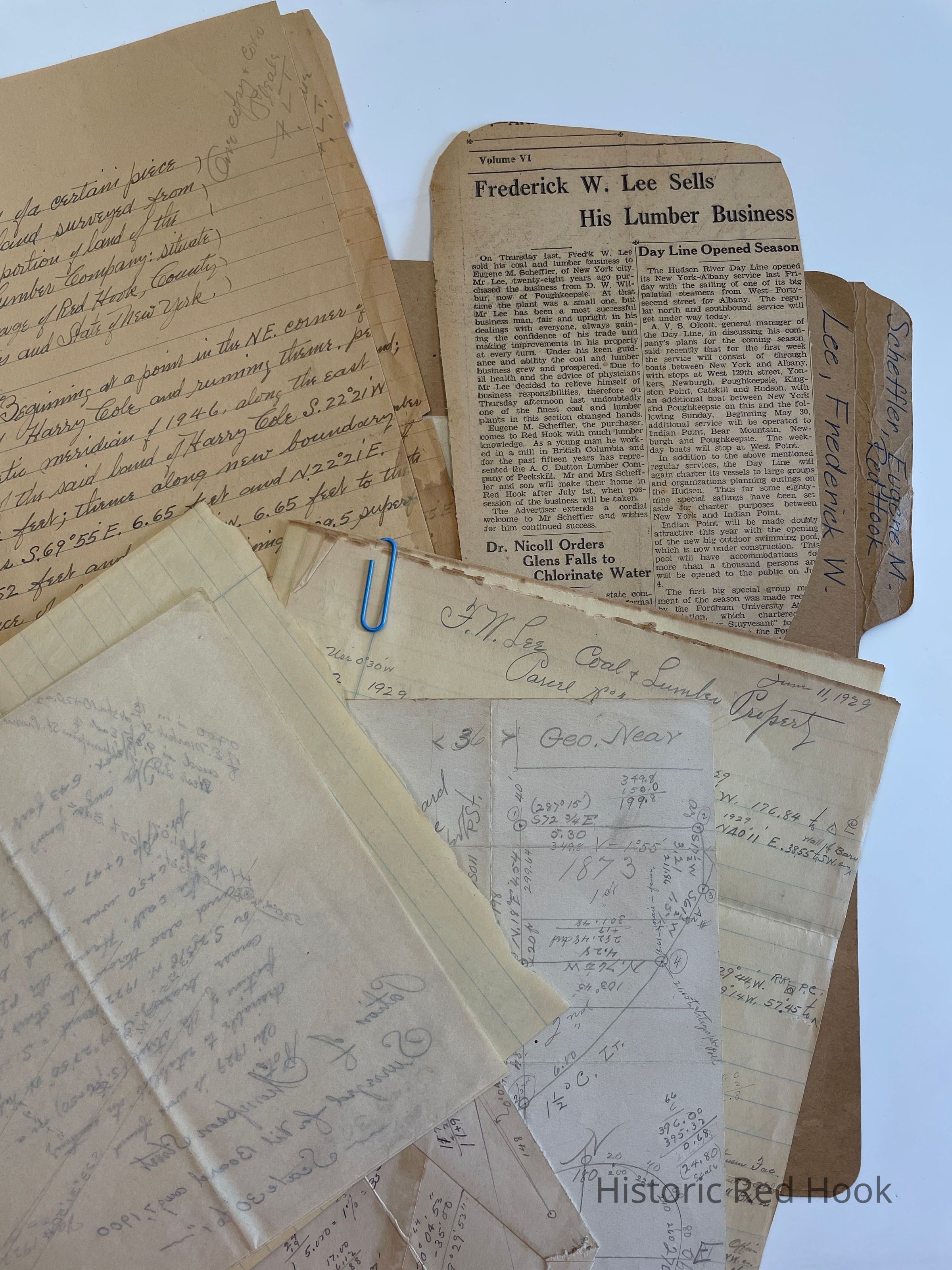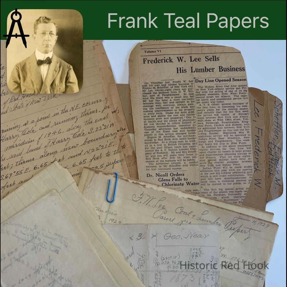 News Clipping: Frederick W. Lee Sells His Lumber Business "Red Hook Advertiser" Maps: Informal pencilled maps of properties along Fisk, Thompson Streets Survey: For Frederick Lee May 1929 F.W. Lee, Coal & Lumber Property Parcel 1- 1.24 acre Parcel 2 0.96 acre; Parcel No.3
