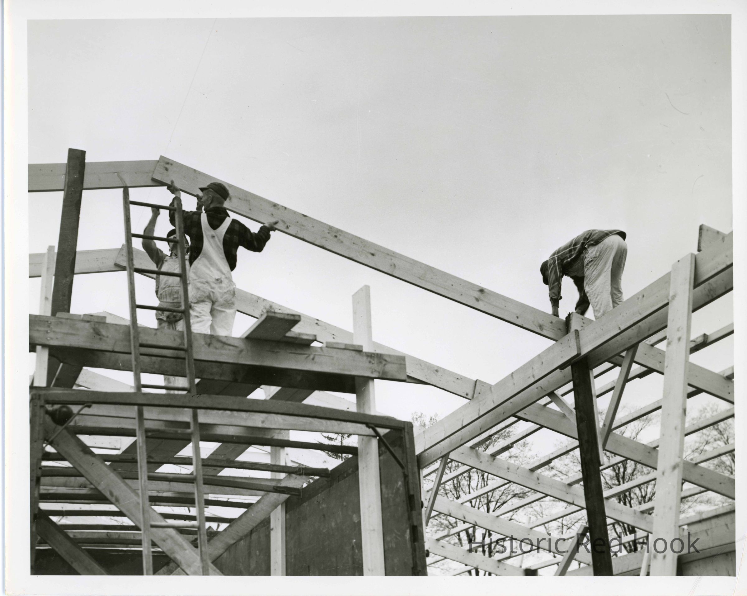 Barn-raising on Thomson property. Workers setting roof rafters on pole barn.Collection