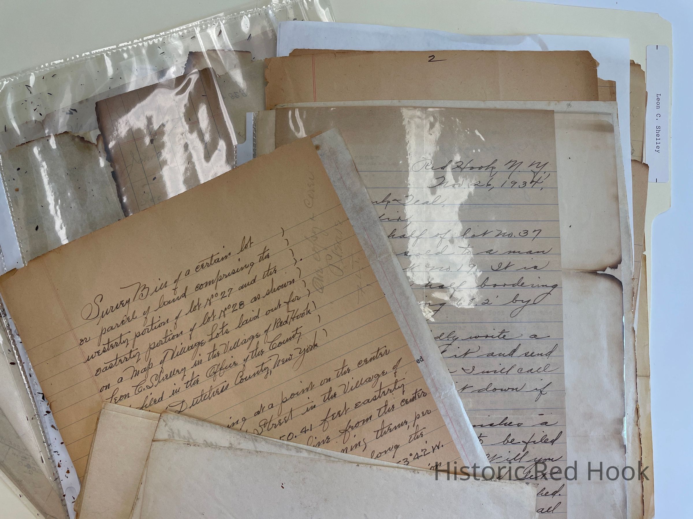 Survey: For Estate of Leon Shelley April 26 193(last number burned). 1.27 acres Survey: For Estate of Leon Shelley 31 May 1934 1.935 acres