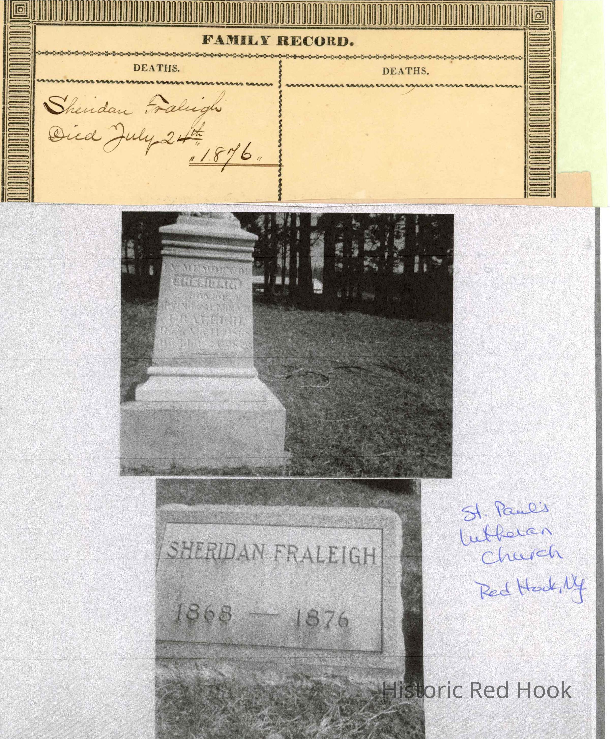Family record of Sheridan Fraleigh, died 1876 and image of gravestone