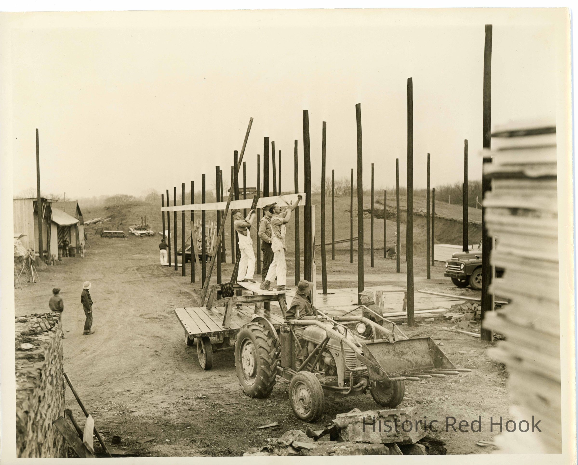 Barn-raising on Thomson property. Workers hammering side support while Norm Thomson on a tractor looks on.Collection