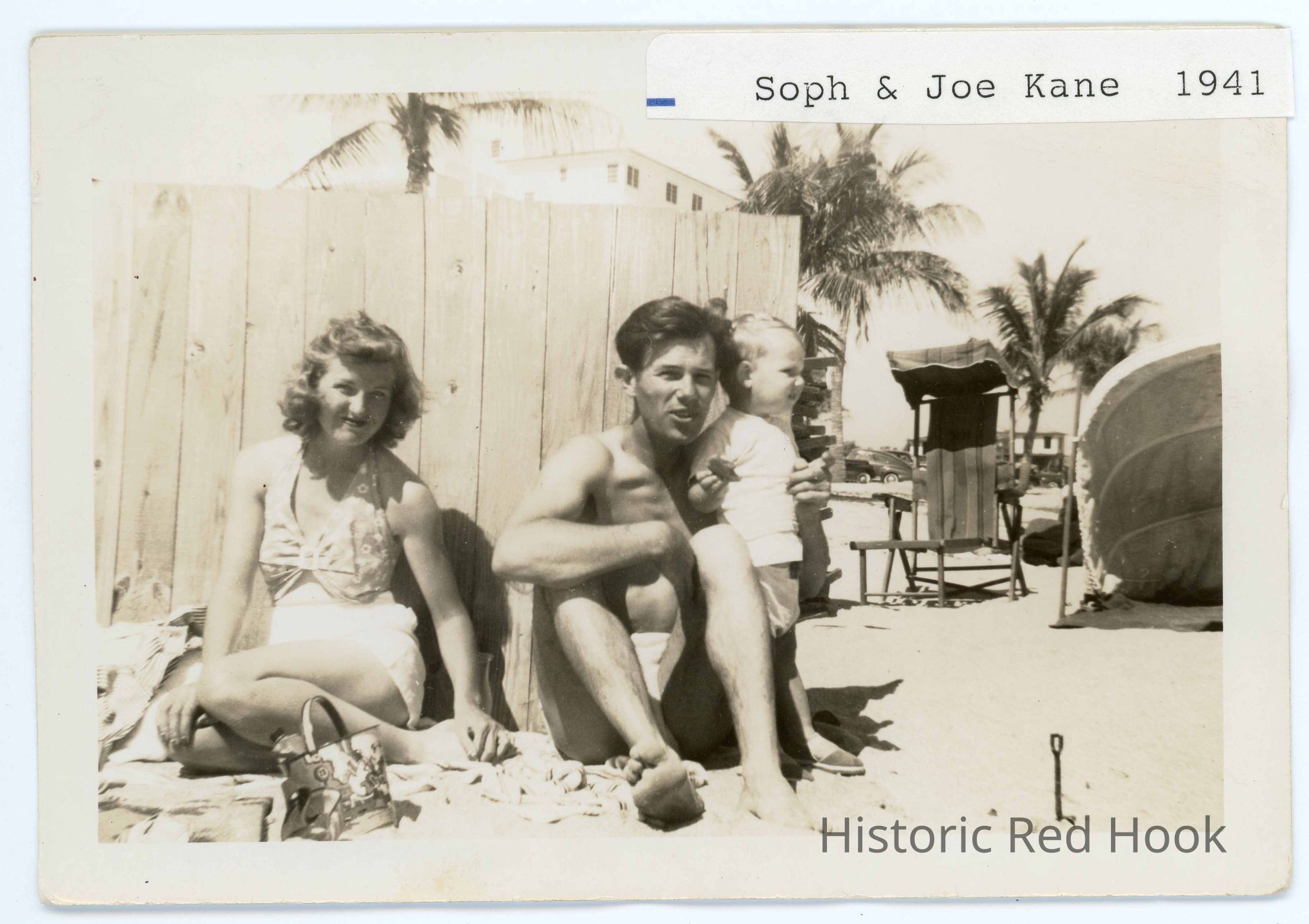 Informal photograph of a young man and woman with a toddler sitting on a sandy beach identified as Soph and Joe (Thomas?) Feb. 1941Photograph Details