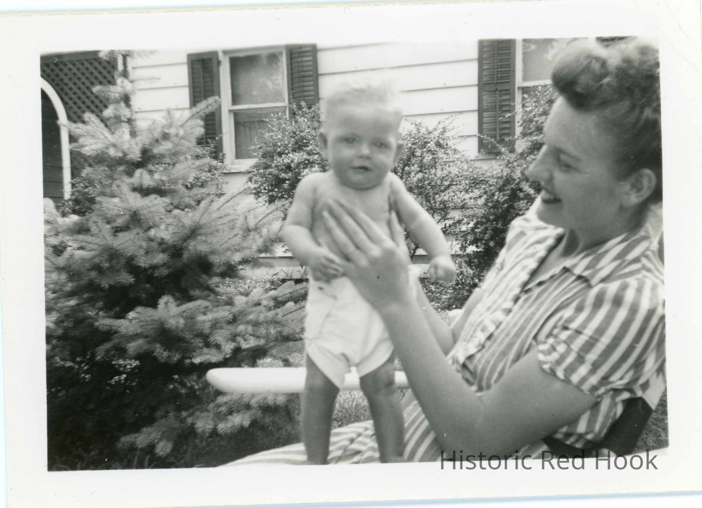 Photograph of a young woman holding a baby outdoors in front of a home identified as Soph & Jo Ann KanePhotograph Details