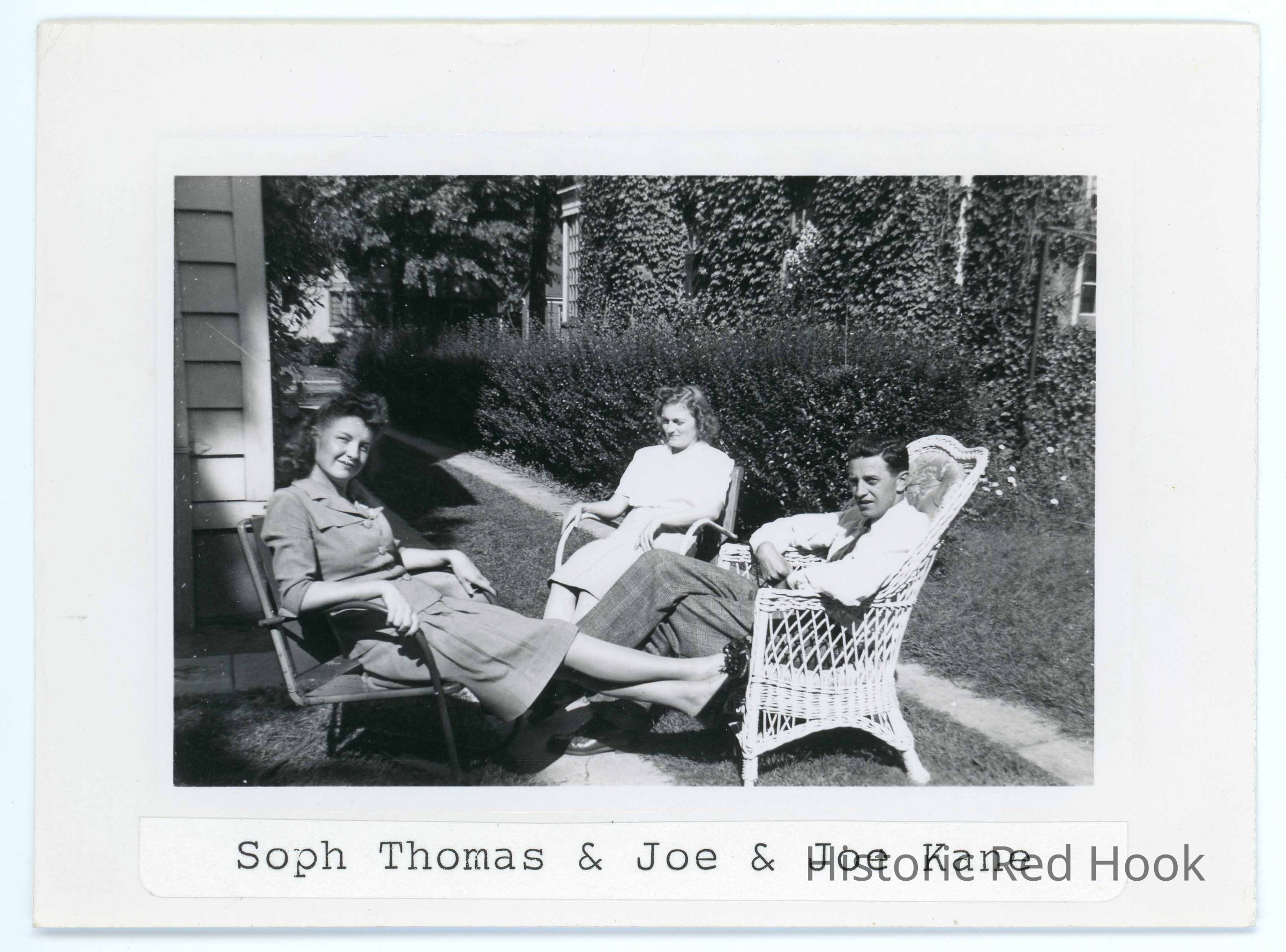Photograph of two young women and a young man seated in lawn chairs near a home identified as Soph Thomas & Joe & Joe KanePhotograph Details