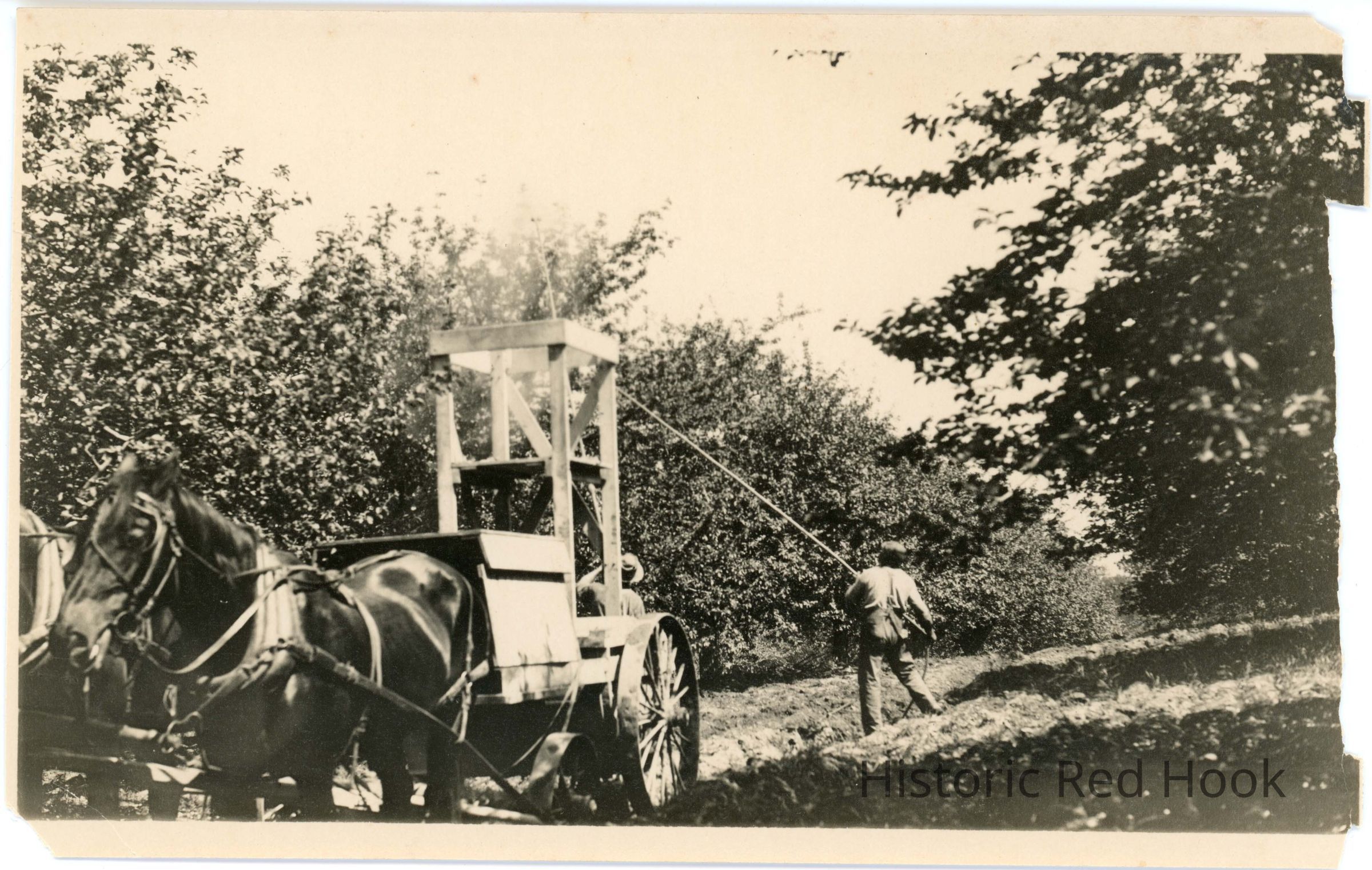 Horse-drawn wagon with spray rig and worker spraying apple orchard, Marked 'east orchard, May 18, 1916 looking NW 11 am.