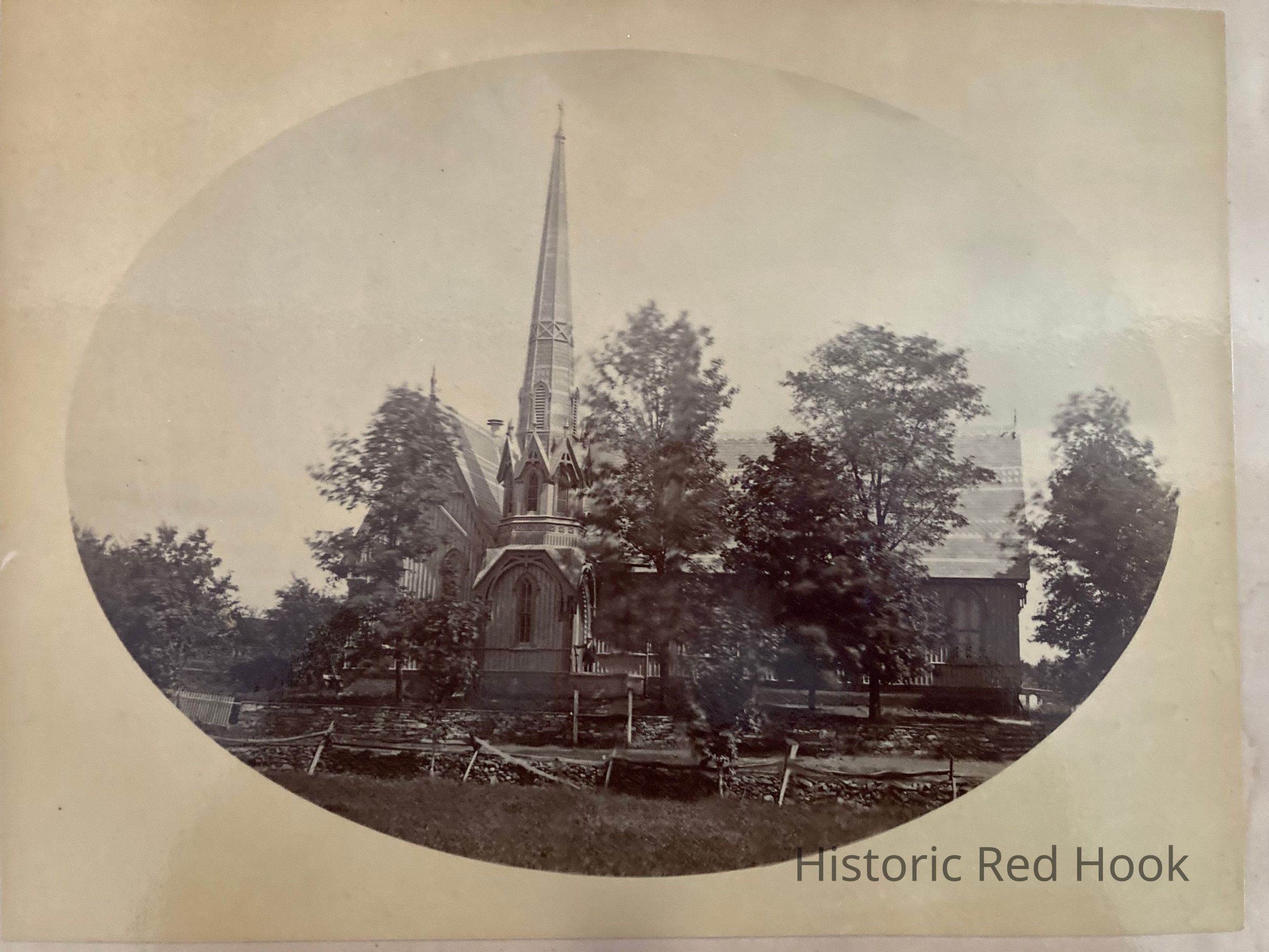 Laminated original photo (oval shape) and color print copy of western view of St. John's Dutch Reformed Church, Upper Red Hook, with its original steeple. Built 1871-1872 and designed by architect J. A. Wood. Steeple was damaged by storms and replaced by a modest spire in 1964.Photograph Details