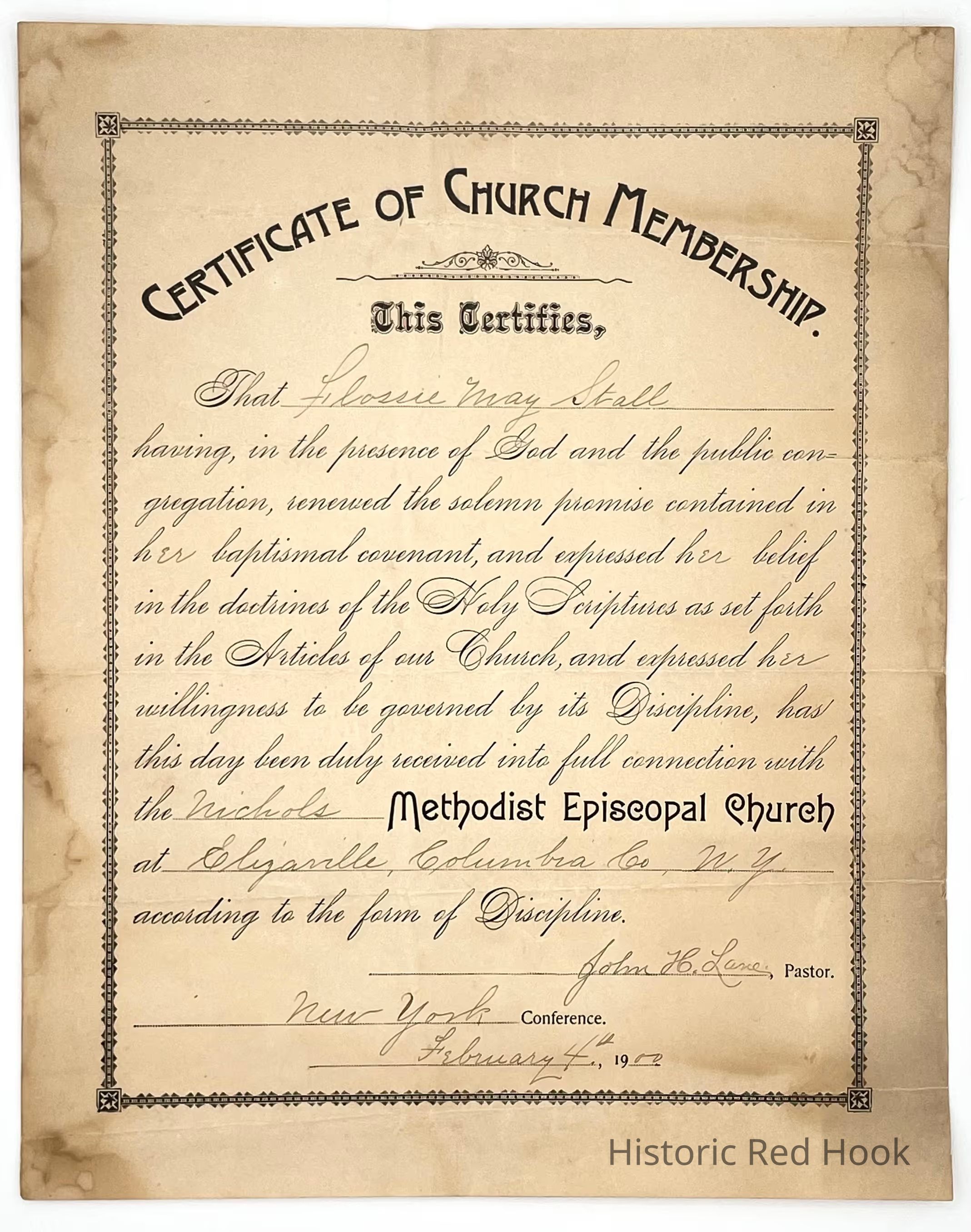 Certificate of Church Membership for Flossie May Stall. To the Methodist Episcopal Church in Elizaville. February 4, 1900 John H. Lane, Pastor