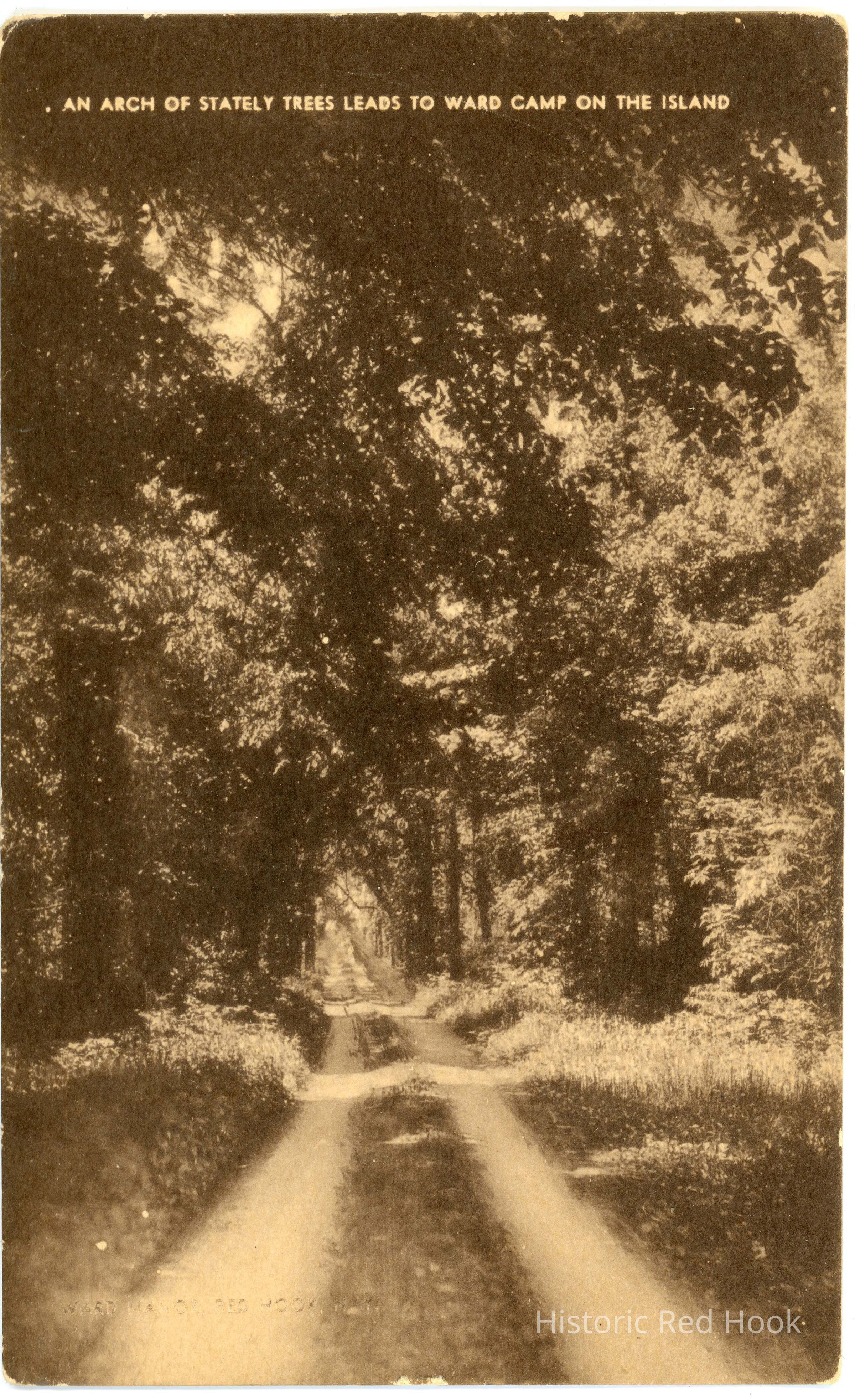 "An Arch of Stately Trees Leads to Ward Camp On the Island"Subject Person/Organization