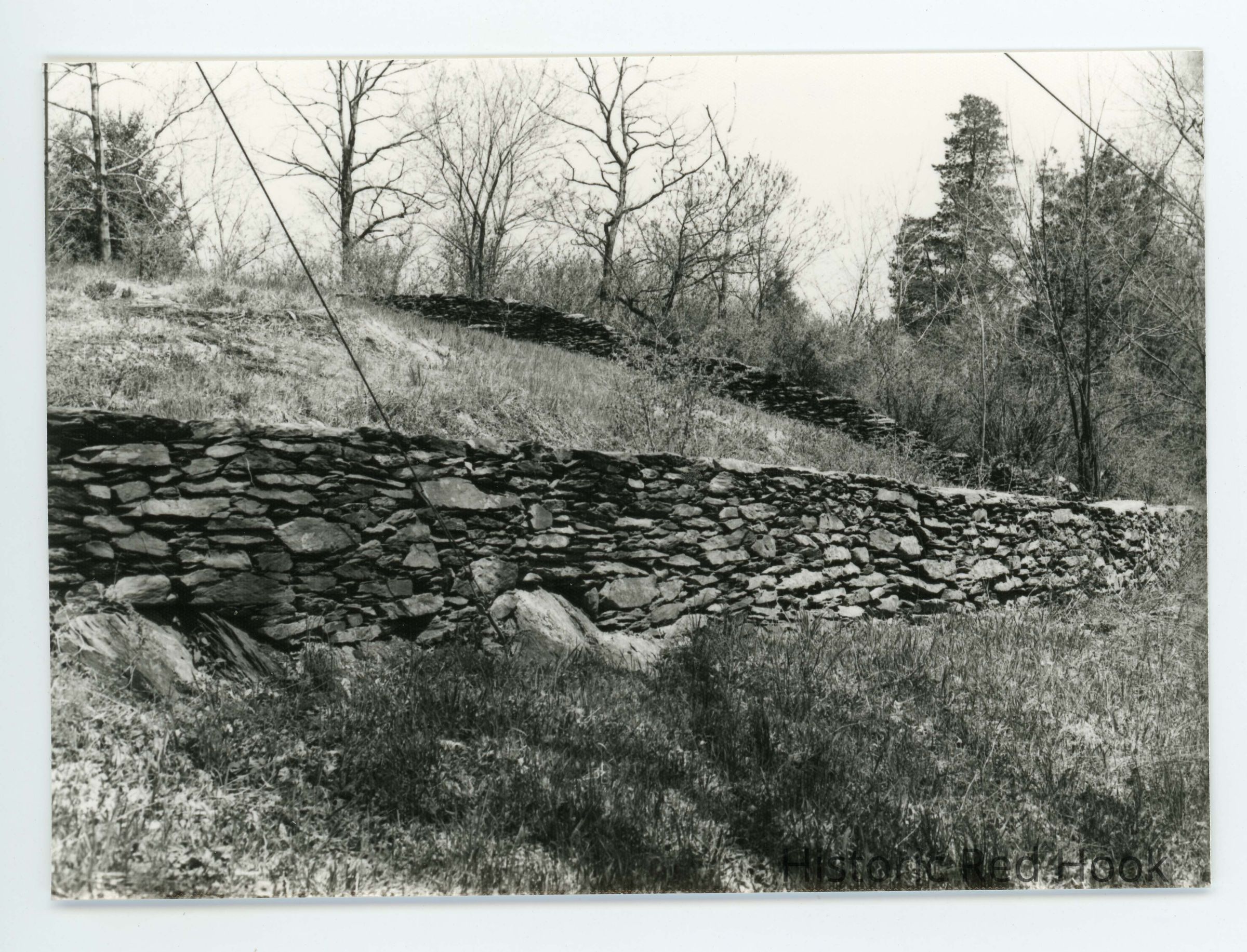 The area is over grown with vegetation and shrubs but the Stone Wall is still there.Photograph Details