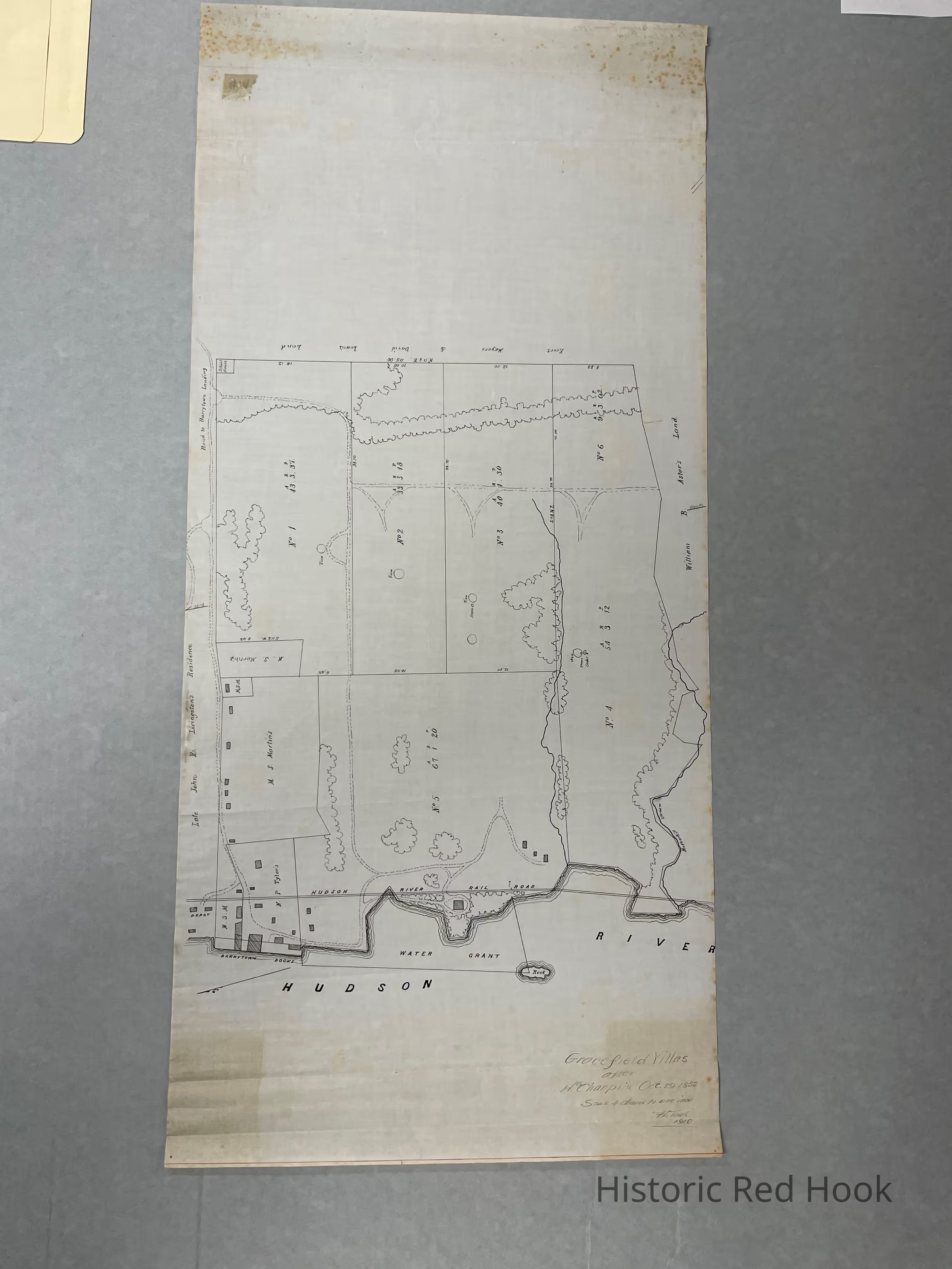 Original survey of Gracefield Villas after H. Champlin dated Oct. 29, 1852. This Survey is by F. L. Teal. The dimensions are 13 3/4" x 30". The scale is 4 chains to 1 inch.