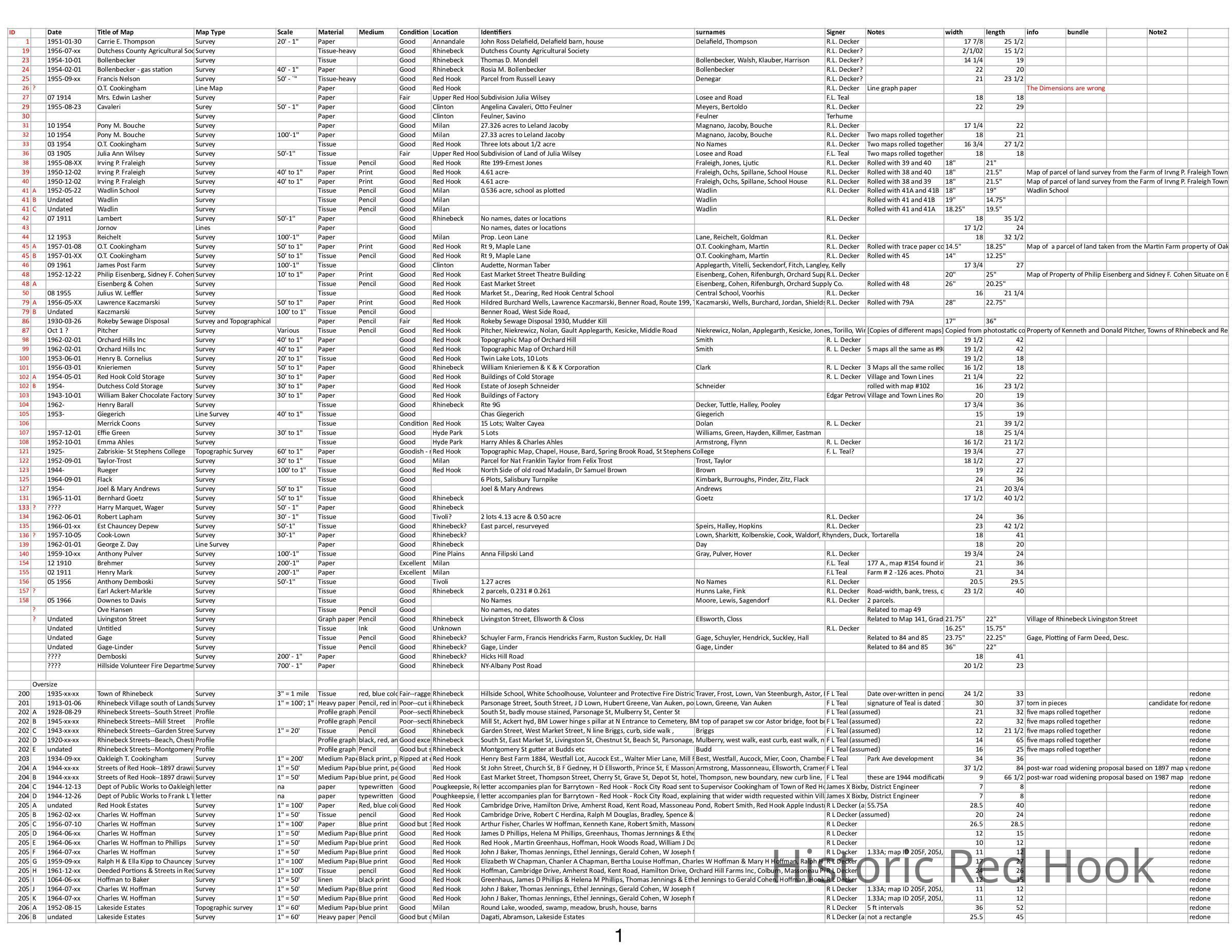 Spreadsheet that compiles a list of the property survey maps by Frank Teal.
