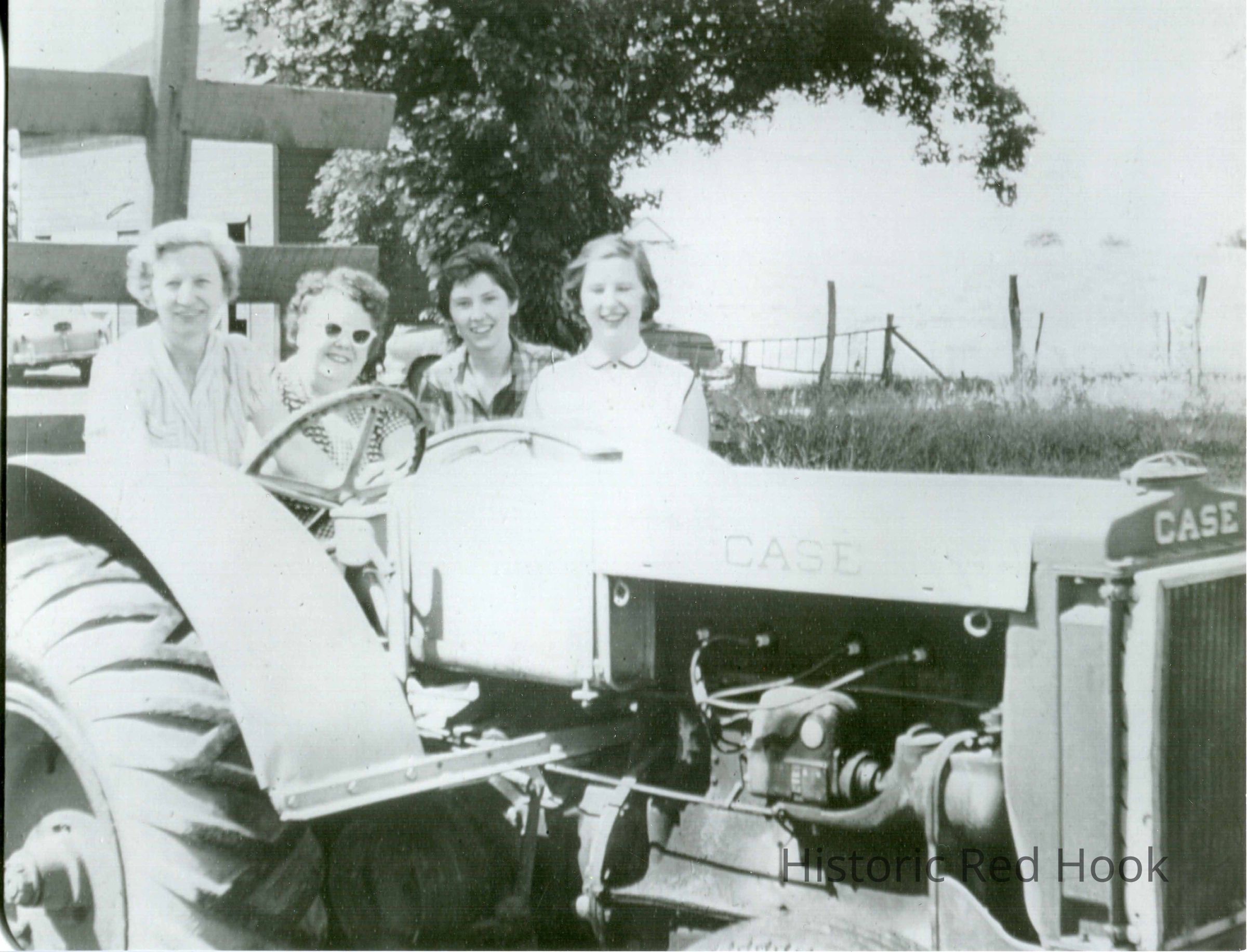From left: Anna Mae Balsam (Baldwin) Teator (1909-2006), her friend Florence ?, Elizabeth and Leona Teator. The Case tractor powered an augur which blew chopped corn into the concrete-block silo, built circa 1948, attached to the cow barn housing the Teator Dairy's holstein cows. The Teators sold the farm in 1964 to Joe Aloy, of Poughkeepsie, and his wife, Katherine Holoczech (sp?), who ran trotter and pacer horses for the next 17 years. The farm passed hands twice more before Woody N. Klose, from neighboring Echo Valley Farm, and three partners bought and developed the Teator farm in the mid-1980s.Photograph Details