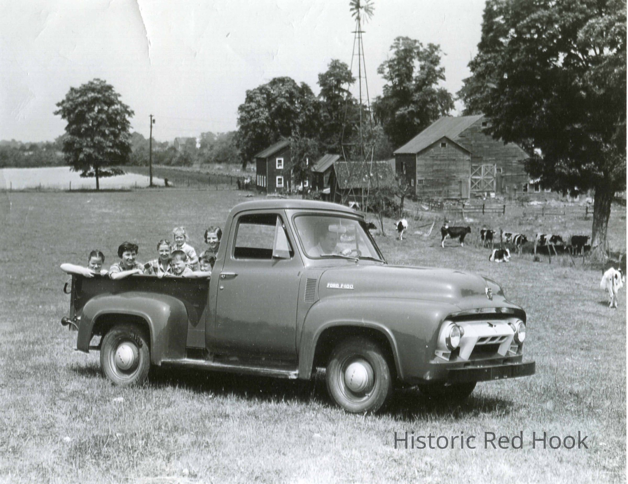 A new Ford truck (1954 F-100) and scene of the Teator farm. (left to right: unknown; Elizabeth Teator Dunham, her sister Marion; Victoria Klose, b 1950 (neighbor from adjoining Echo Valley Farm); Vincent "Vinnie" Day, 1944-1957; Deborah "Debbie" Klose, b 1947; Leona Teator, and "Daddy" Harry Vincent Teator, 1895-1975, at the wheel. This photo was taken for a farming magazine, Farm Journal or Successful Farming.Photograph Details