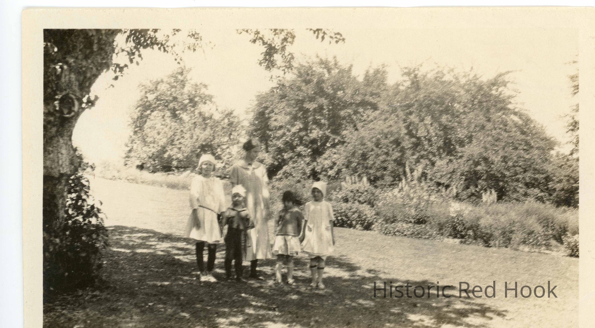 Photograph of a group of children pictured outdoors near a garden. They have been identified as Elizabeth (Betty) Hefferman, Marion Teator Losee, Ron Losee, Jeanette Teator Cole, Josephine Hefferman c 1924 Teator GardenPhotograph Details