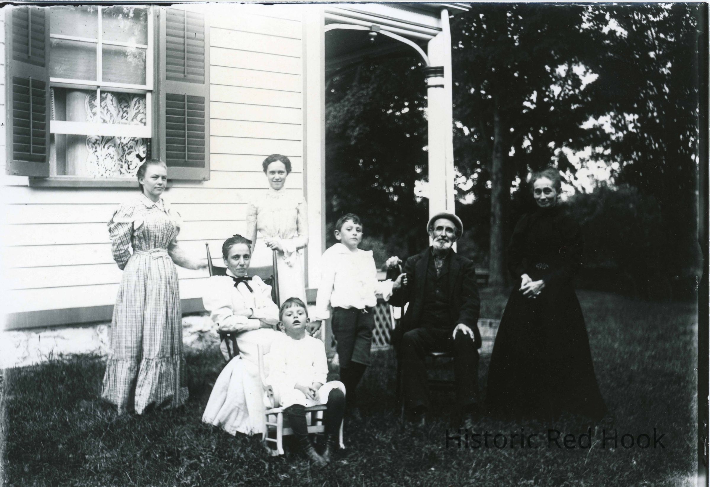 Outdoor photograph of a group of adults and children pictured next to a house seated and standing on the lawn identified as the Myers Family of Upper Red Hook.Photograph Details