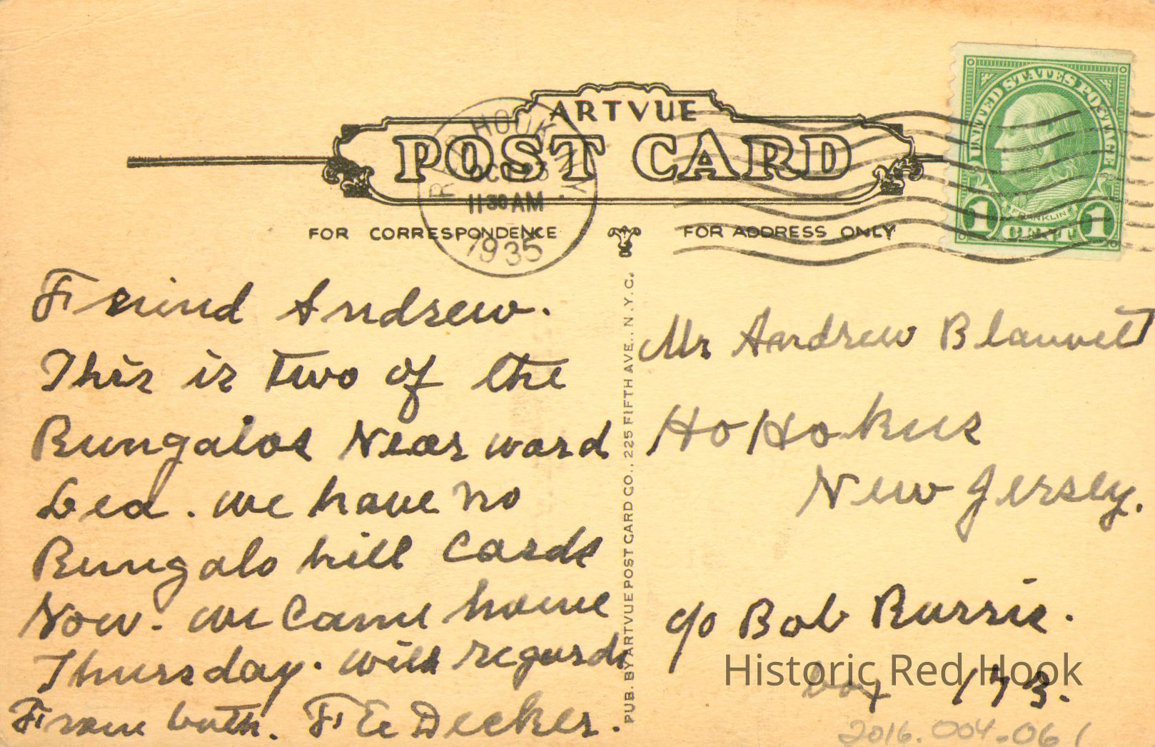 This is two of the bungalos (sic) near Ward Lea. We have no Bungalo (sic) hill cards now. We came home Thursday. With regards from both. FE Decker