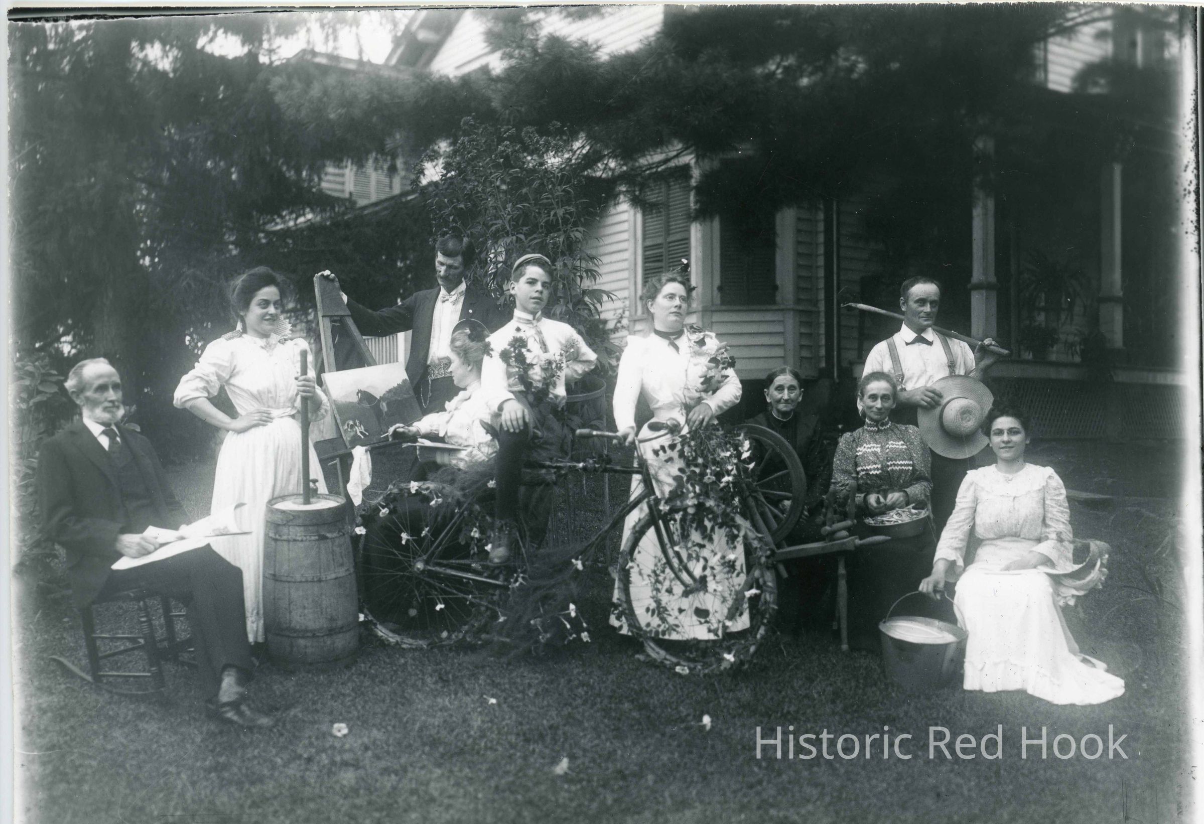 Group pictured on the lawn in front of a house depicting activities identified as the Vosburgh group - House and family about 1904 E.Kerley Corners Road. Ref. 2014.008.203 WS Teator glass plate negative collection # 10 Neighbors (image) reversed. Written on a card from left to right: Mr. Burke-friend, George Vosburgh, Fannie Vosburgh Coon, Grandmother-Marie Proper, Ellen Vosburgh, Henriette Vosburgh Myers-Nena Teator's sister-in-law, Katharine Vosburgh, Friend, Ed VosburghPhotograph Details