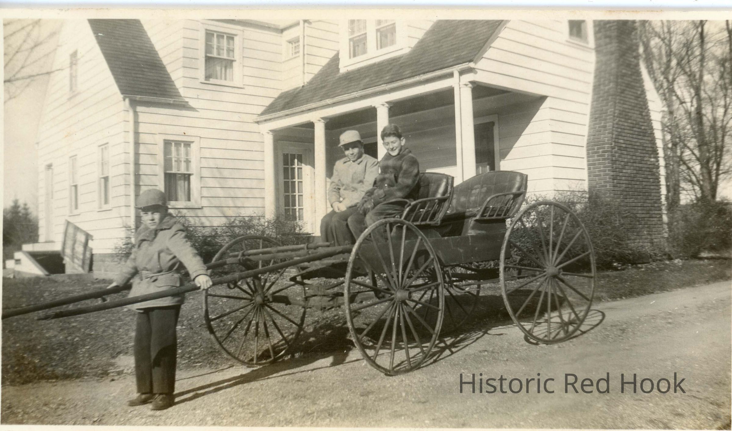Black and white photograph of three young boys: Benny Horton, Brandt Griffing, Eddie Eisenberg. Two boys are sitting on a horse drawn wagon. The other boy is standing where the horse would be attached. Clapboard house in background.Photograph Details