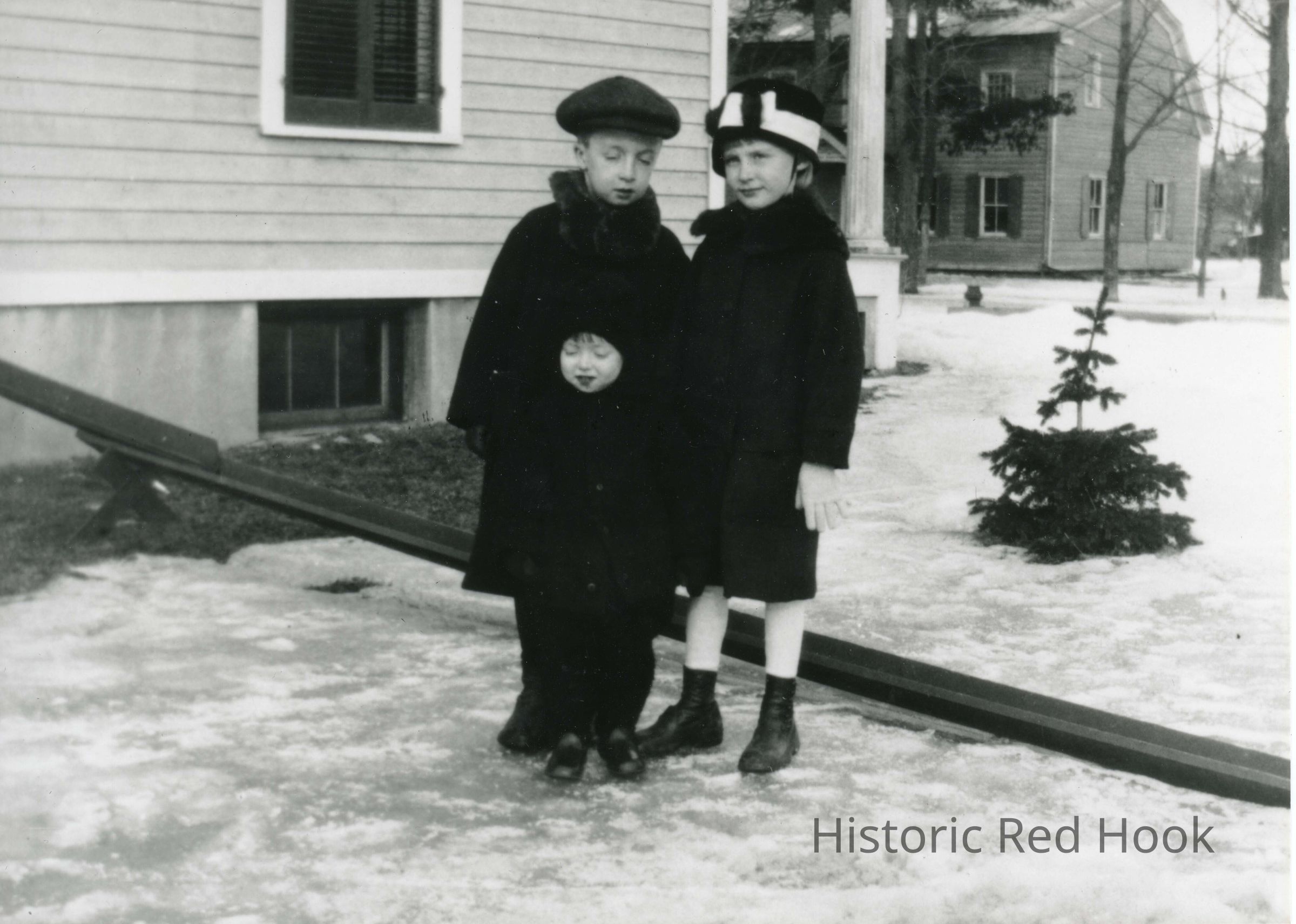 Three Schutte children posing in winter clothes. Little girl is Gertrude Schutte (1914-1983). The house is 7557 North Broadway where she was born. Older girl is Margaret (Honey) Schutte Stockenberg (b 1911), the boy is Harold Schutte (1910-1949).Photograph Details