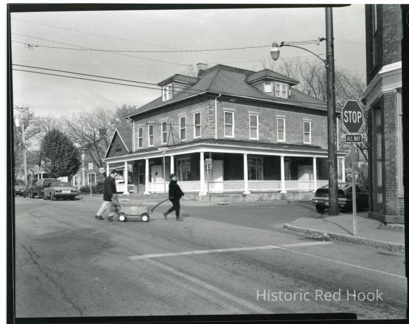 View of Tivoli - two men with a cart crossing four corners - looking at hotel on northwest corner, 1980s-1990s