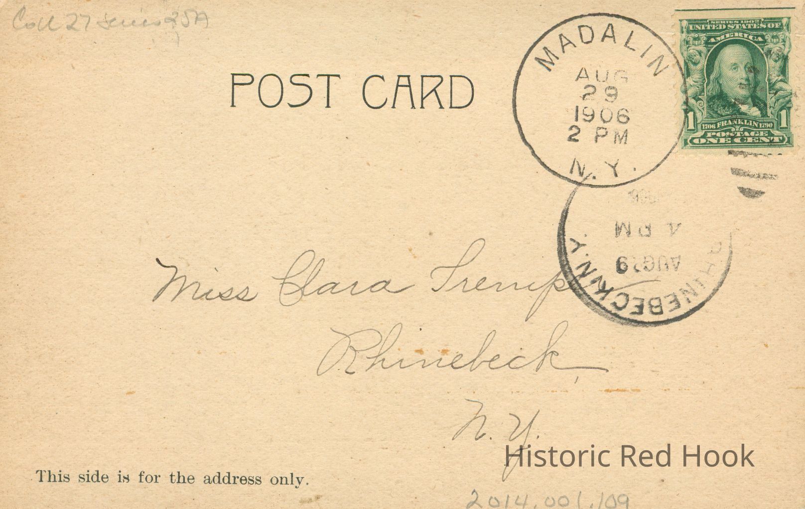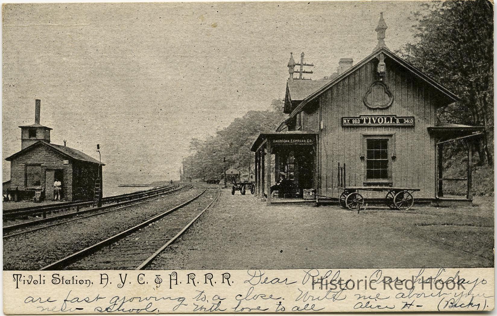 Postcard of of the Tivoli train station, N.Y.Central & Hudson River.R.R, postmarked August 29, 1906. The station sign tells the traveler the distance to New York (99.0 miles) and to Buffalo (341 miles). A sign for American Express hangs above the porch. The postcard is addressed to Miss Clara Tremper, Rhinebeck, N.Y.. The message reads "Dear Polly, Our holidays are fst growing to a close. Write me about your new school. With love to all, Alice H. (Becky).Subject Place