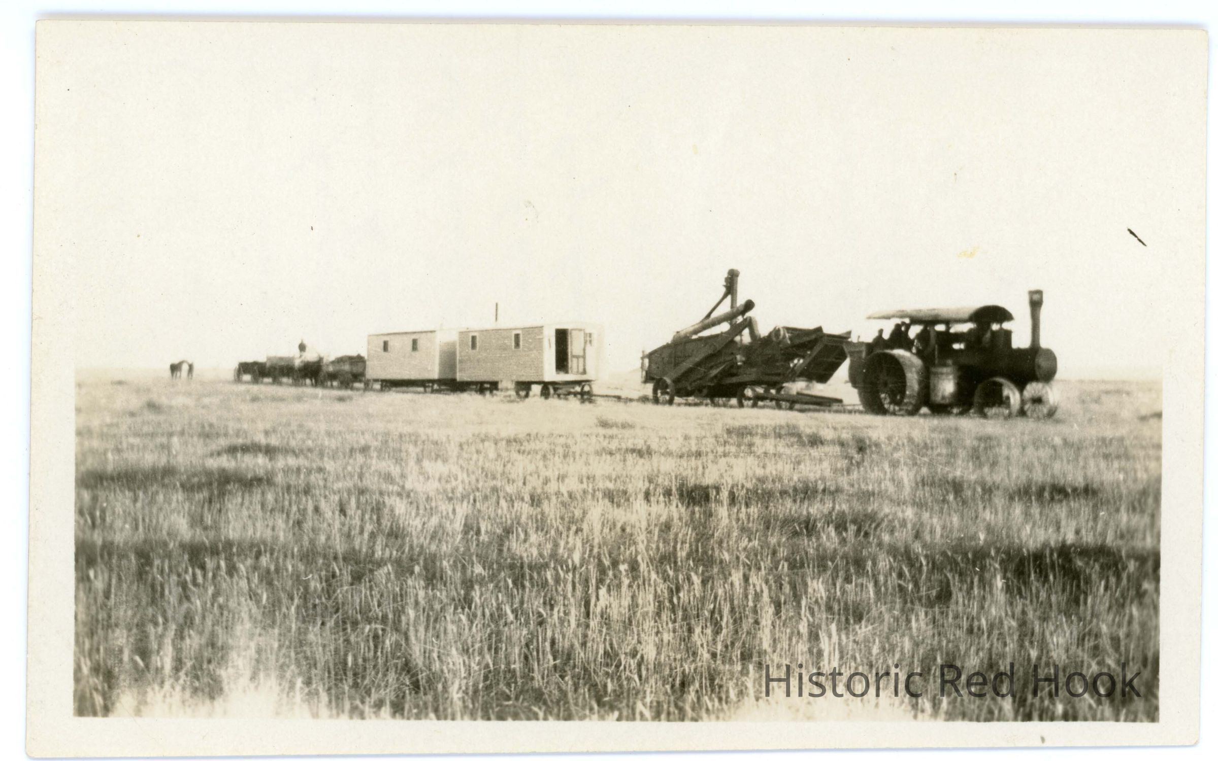 Trailers pulled by Rumely oil pull. " Pulling Home Cook car & Bunk Car in Rear of Seperator. Each car 10x24. I built cook car last summer & a cyclone hit it the night I finished. It blew it over four times (cook was in it but not hurt) & tho car damaged very little"Collection