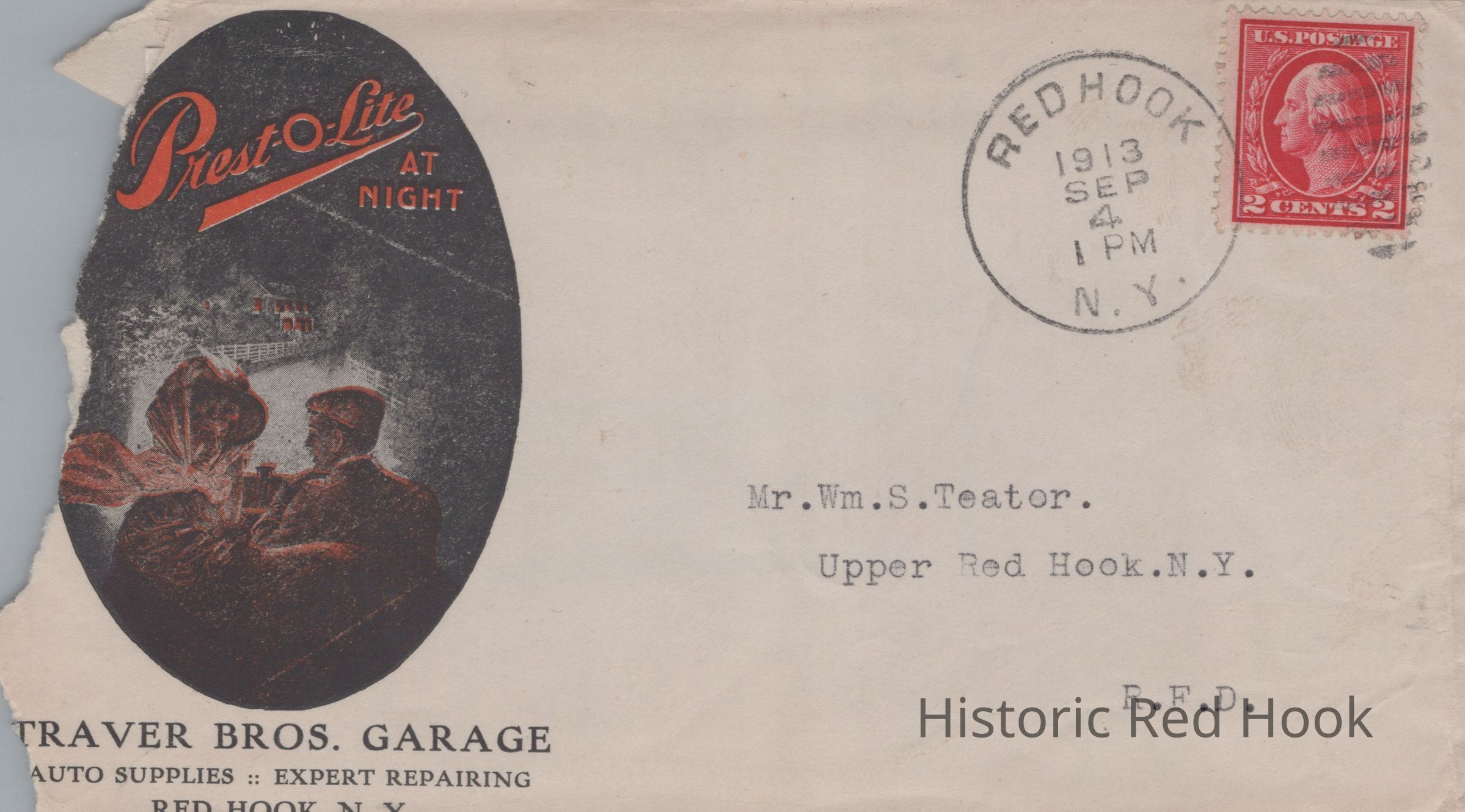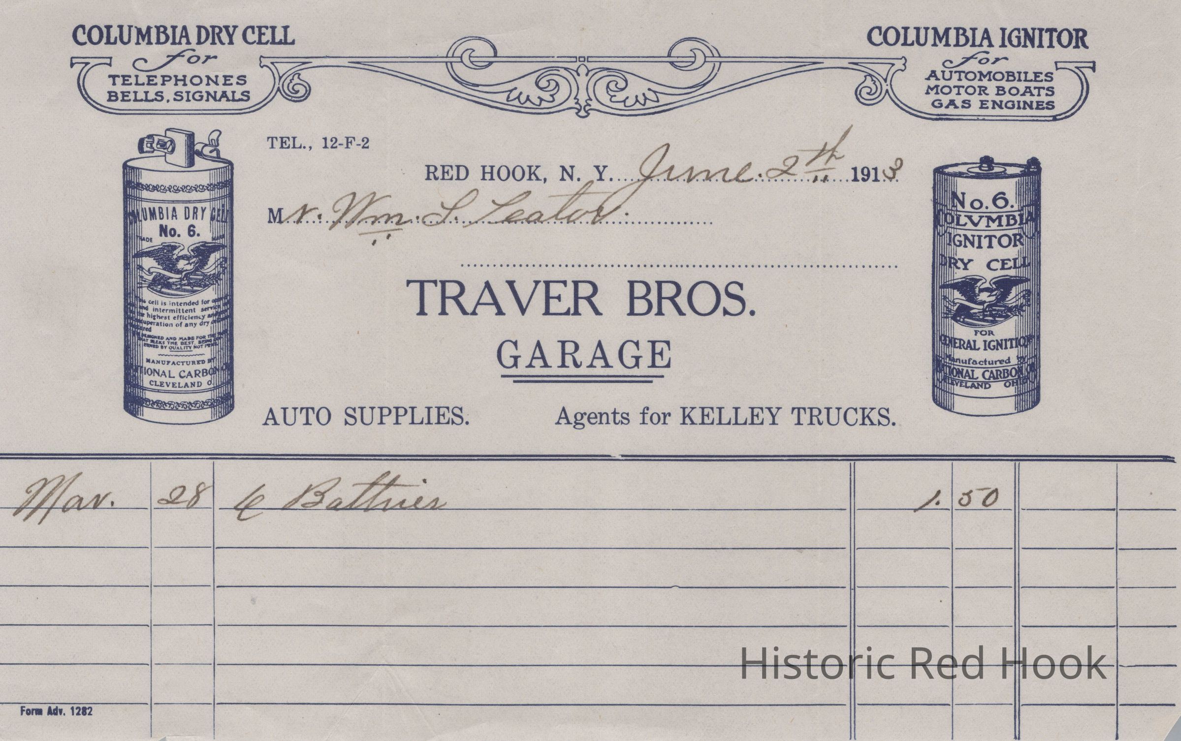 Traver Bros. Garage invoice, dated June 2, 1913 and envelope, postmarked June 24, 1913, addressed to Wm. S. Teator for the March 28 purchase of six batteries for $1.50.Relationships