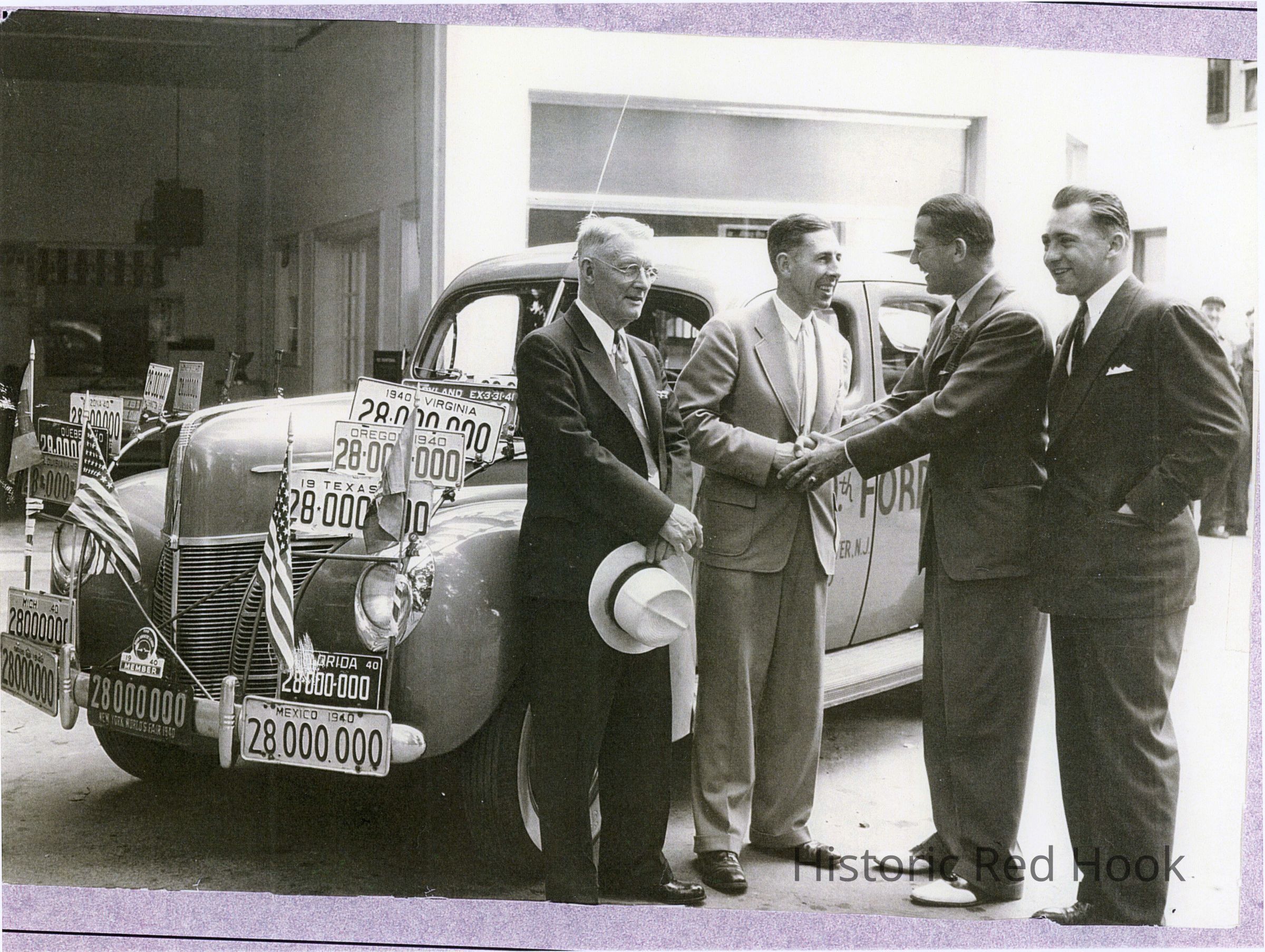 L-R Henry Brenzel, Mayor of Red Hook and Stanton Tremper, Sr., owner of Central Auto Sales, and two unknown Ford executives. The car was the 28 millionth Ford manufactured by the Ford Motor Co.Photograph Details