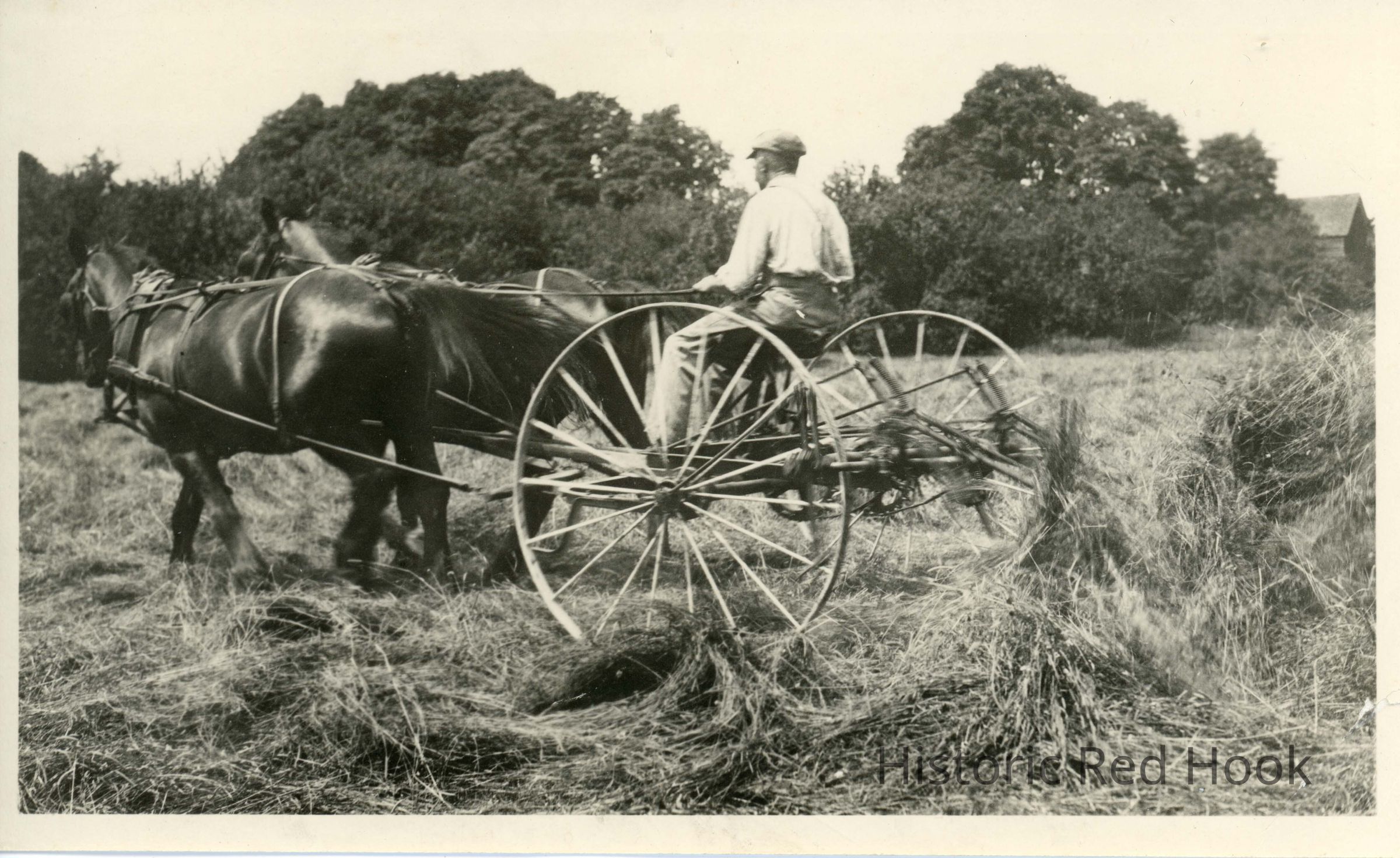 Two horses are pulling a hay tedder, turning hay. (Glass plate negative in W.S. Teator collection 20018.006)Collection