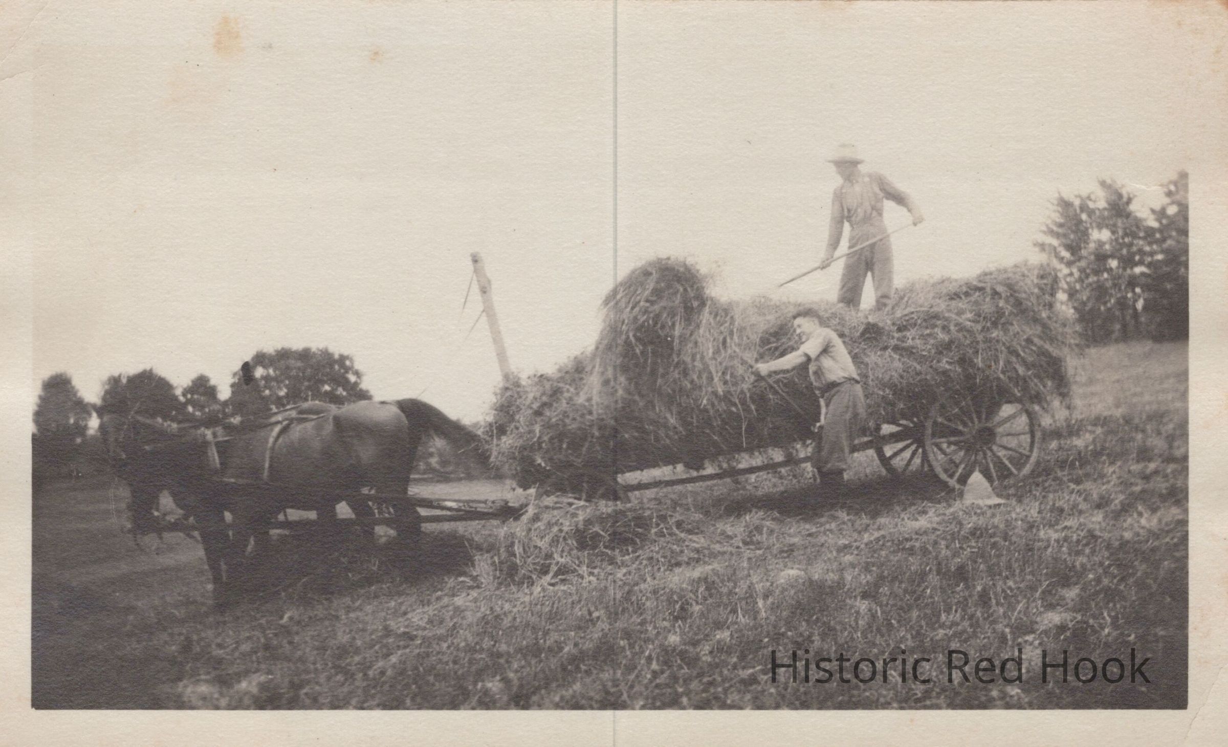 Two men pitching loose hay on to wagon pulled by a team of horses.