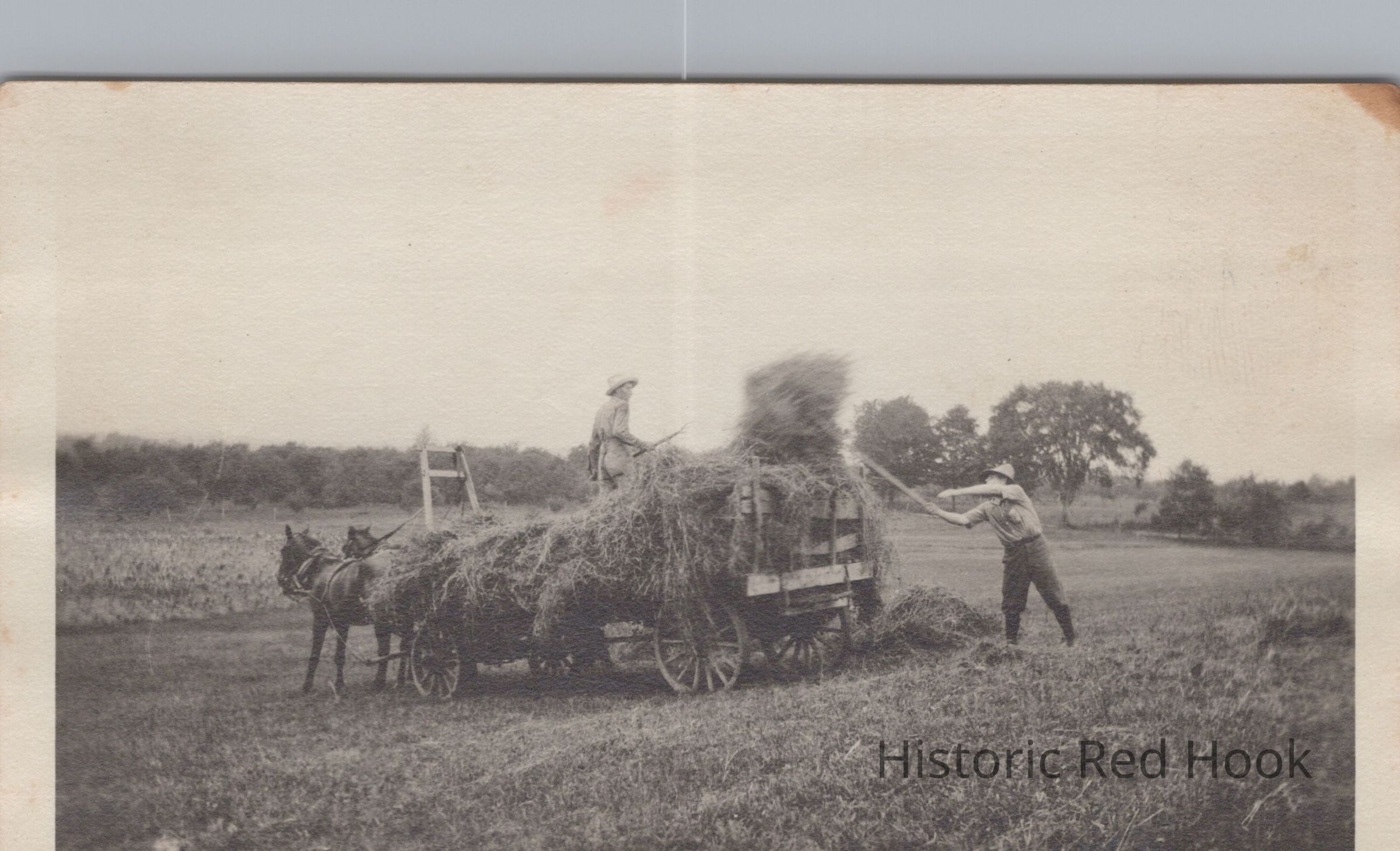 Photo of two men pitching loose hay onto wagon pulled by a team of horses. The name Joe Thomas written on back.Collection