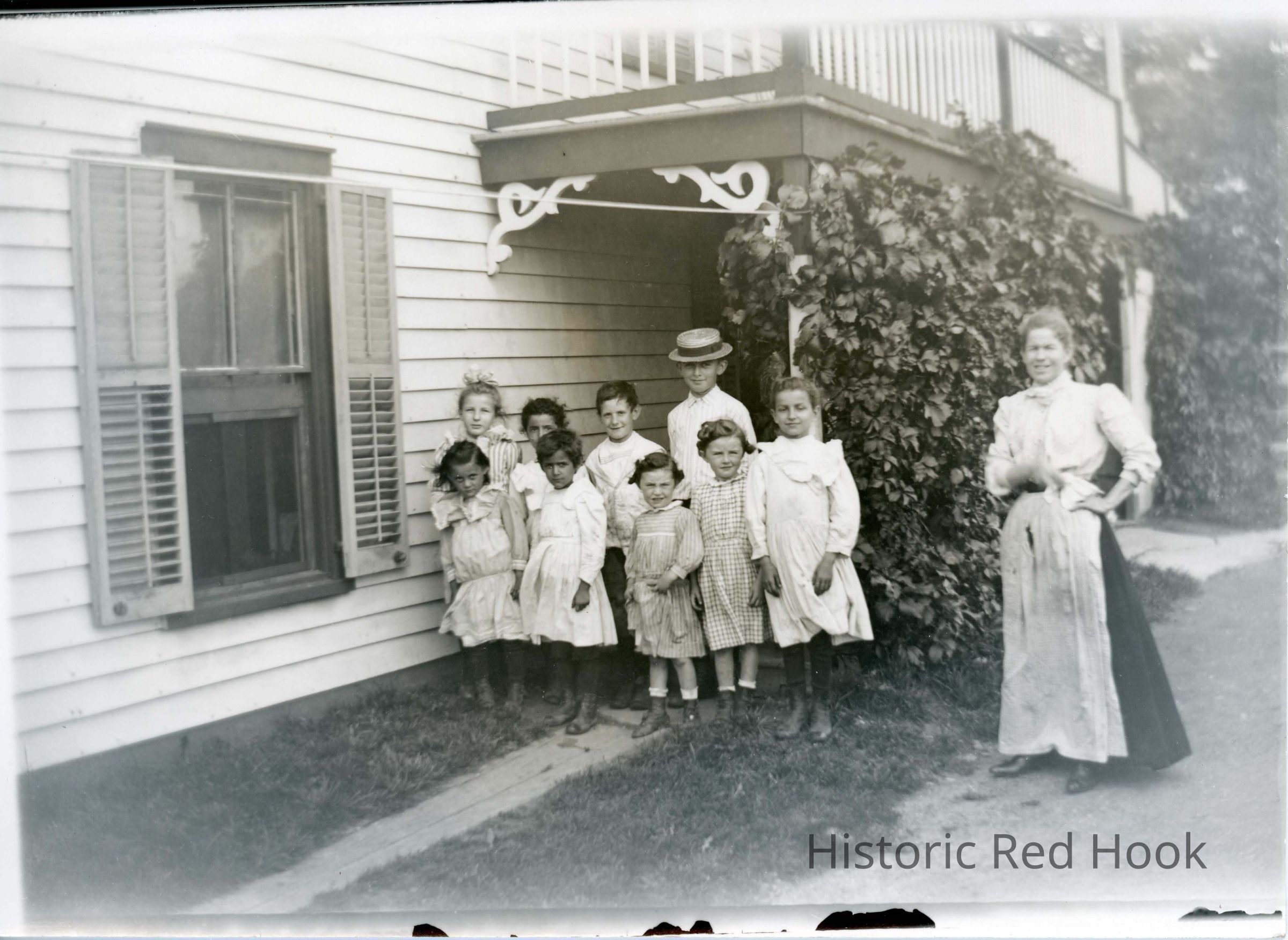 Unknown children and women outside a house