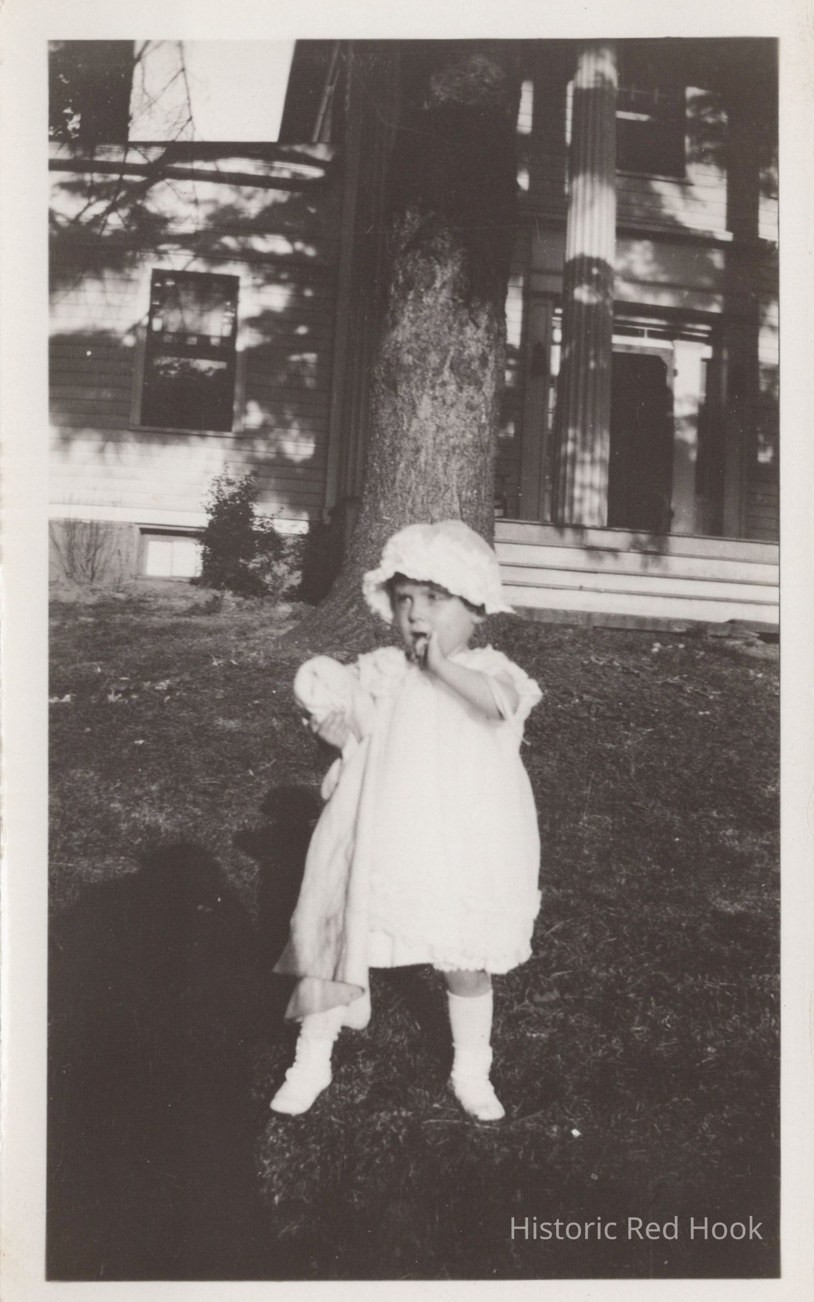 A photograph of an unidentified toddler posed on the front lawn of a Greek Revival housePhotograph Details