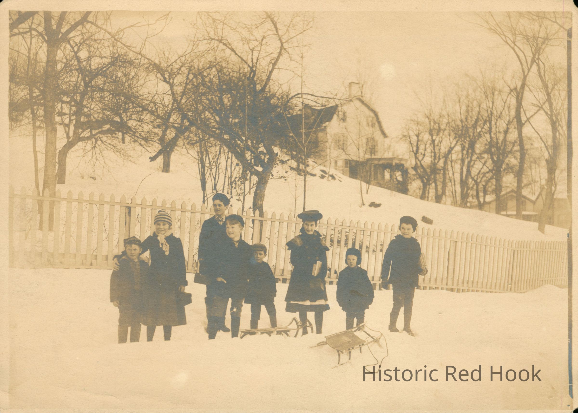 .An outdoor photograph taken during winter of Jim Losee with seven other Upper Red Hook children.Photograph Details