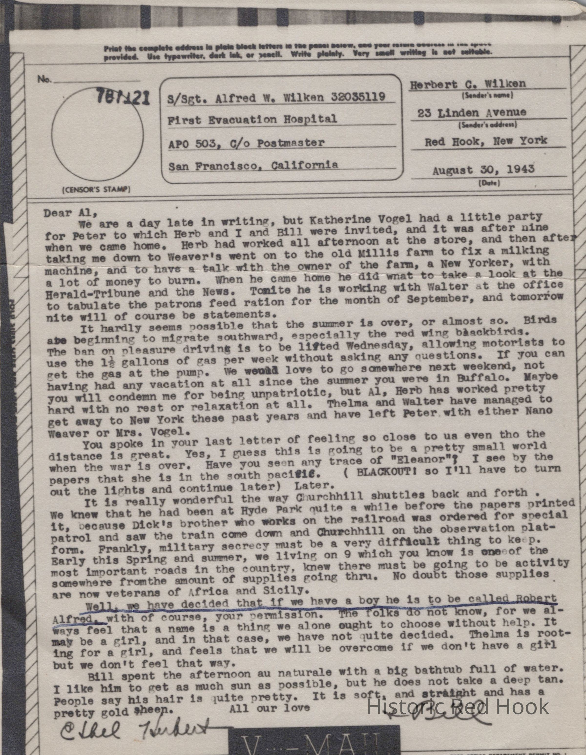 In this letter dated 08/30/1943, Ethel informs Alfred of local news including that fall is in the air, family events, gas rationing (she longs for a vacation but can’t take one due to no gas being available), and other events. It touches her that these letters mean to much to Alfred, he recently stated of feeling so close to the family even though the distance is great. Mentions Churchill and ‘Eleanor’, including Churchill’s visits to Hyde Park.Collection