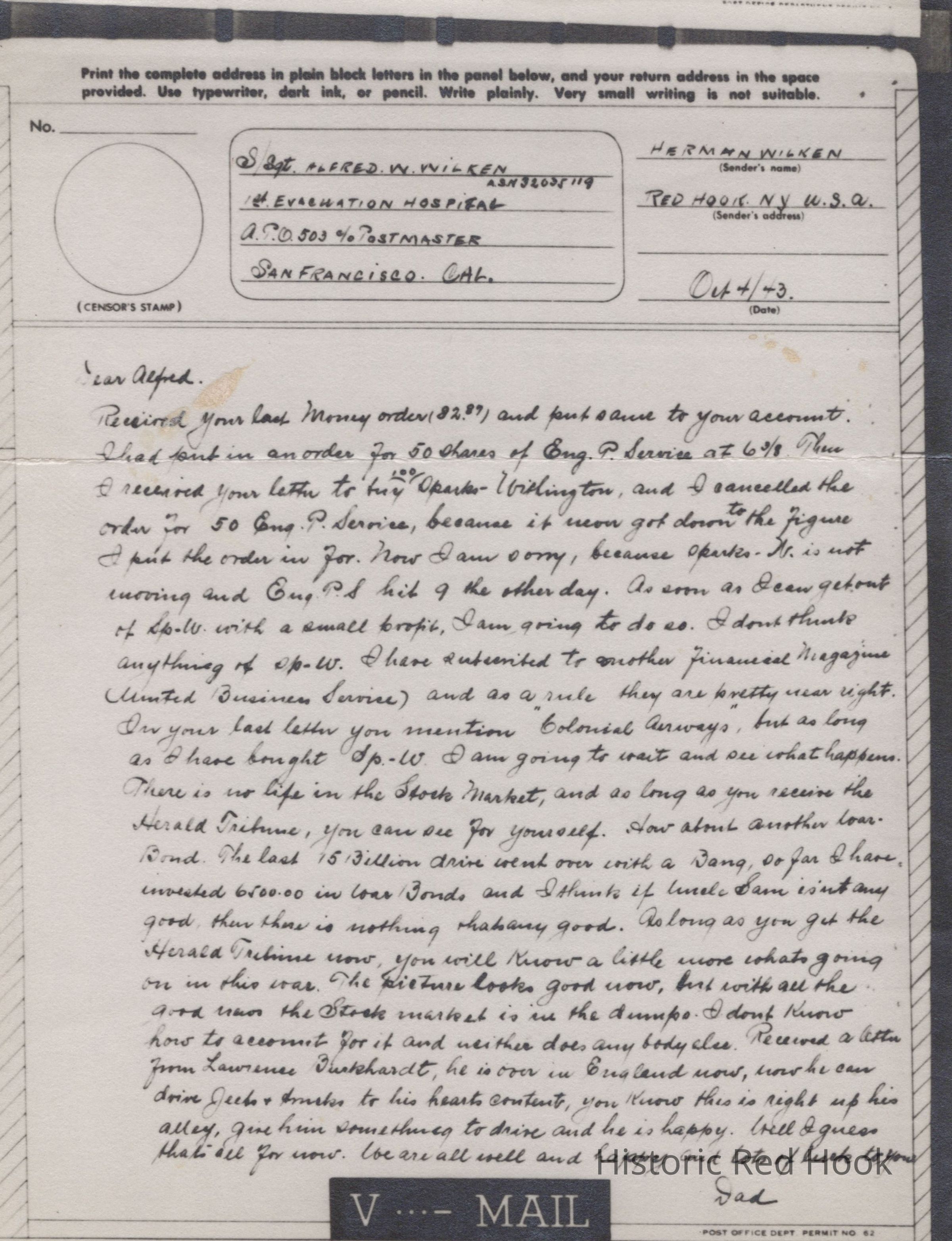 V-Mail Letter from Herman Wilken to Alfred W. Wilken, 1943Entry/Object ID