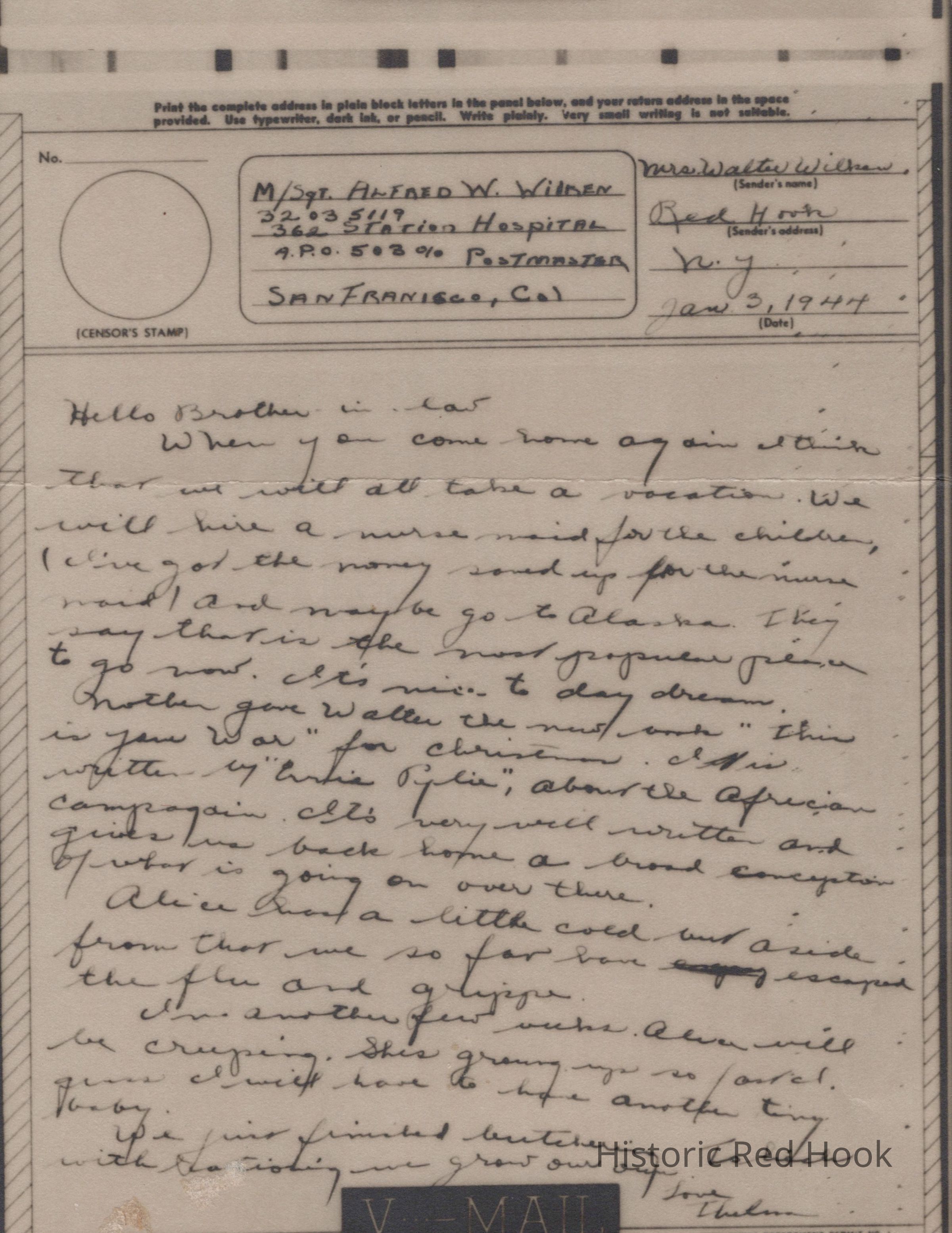 V-Mail letter from Mrs. Walter (Thelma) Wilken to her brother-jn-law Alfred Wilkin, written 01/03/1944. In this handwritten note, she writes to cheer Alfred with talk of a family trip to Alaska when he returns from war. She catches him up on family events.Collection