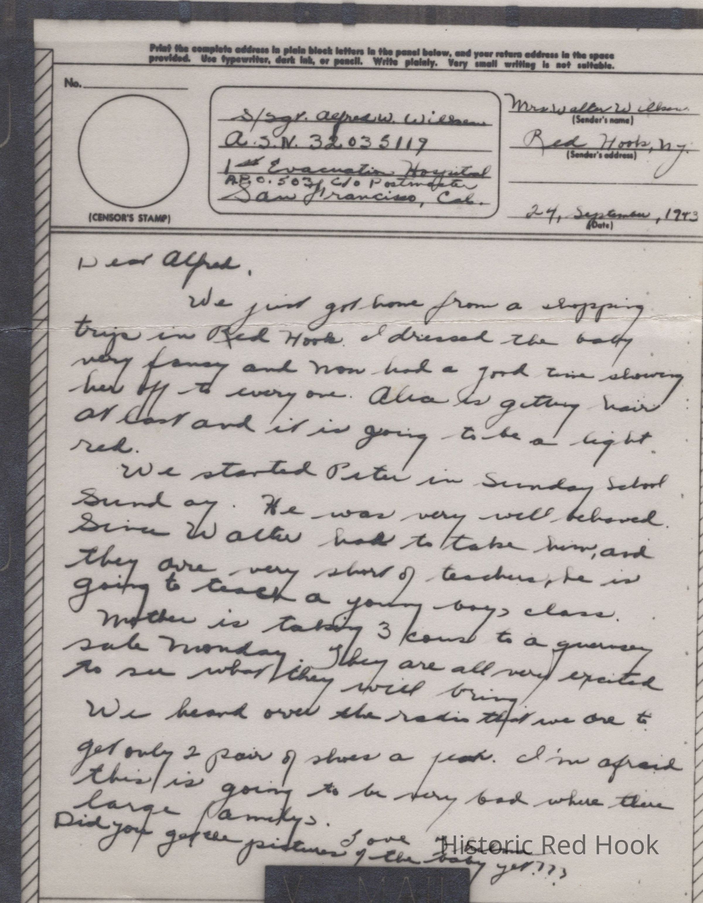 In this letter dated 09/24/1943, Thelma informs her brother-in-law Alfred about recent happenings, including a shopping trip and continued rationing. Peter (her son?) has started Sunday school, and husband Walter will teach the young boys’ class due to a shortage of teachers.Collection