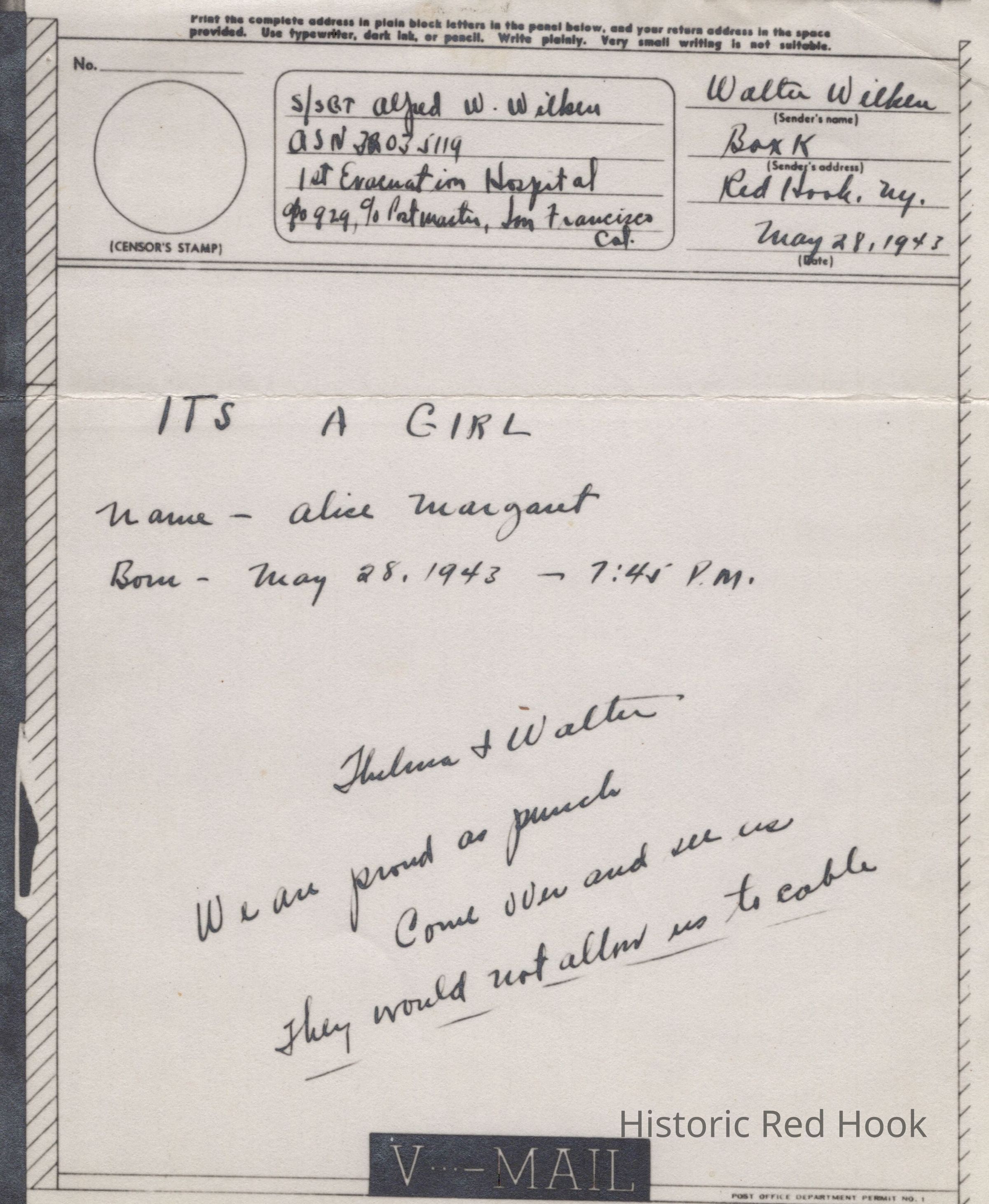 V-Mail letter from Walter Wilken to his brother Alfred Wilken, dated May 28, 1943. Alfred was serving in the military during World War II. The big news is “It’s a Girl!” named Alice Margaret, born May 28, 1943, likely the daughter of Herb and Ethel Wilken. Unlike most V-Letters in the collection, this one is printed, not typed, as “they would not allow us to cable”. It includes Thelma as announcing the good news.Collection