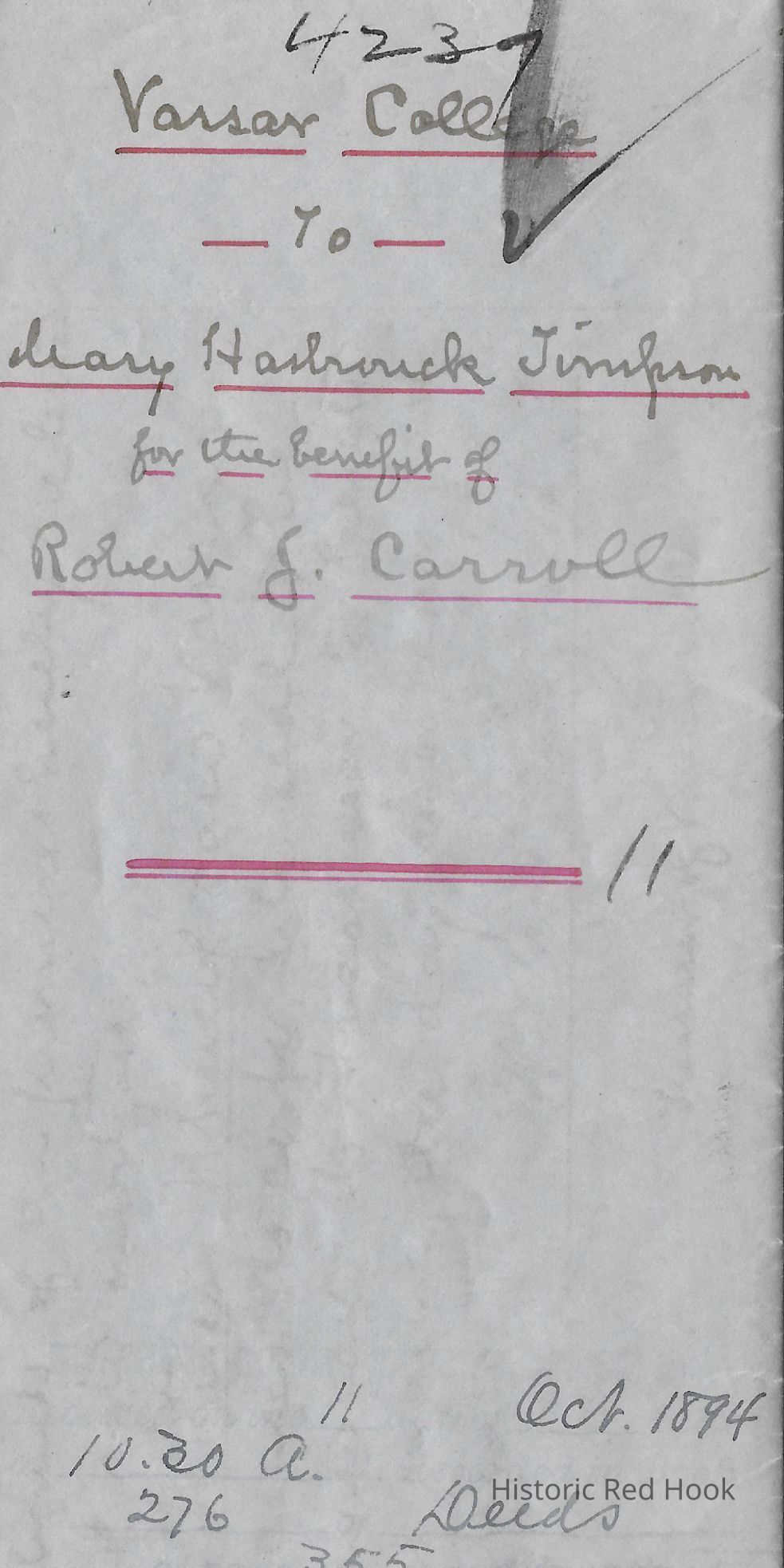 Original deed from Vassar College to Mary Hasbrouck Timpson for the benefit of Robert Carroll