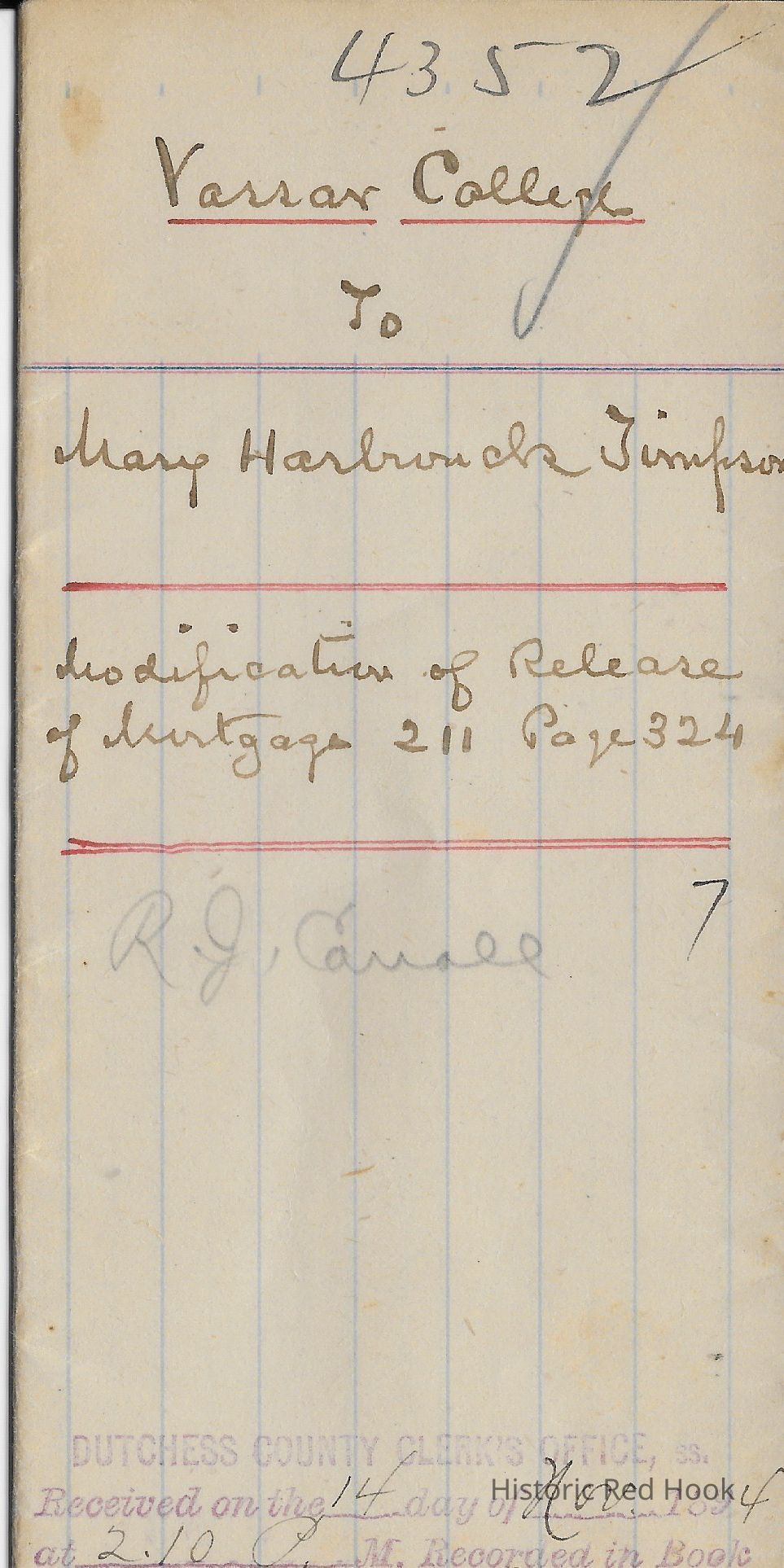 Original deed from Vassar College to Mary Hasbrouck Timpson for the benefit of Robert Carroll