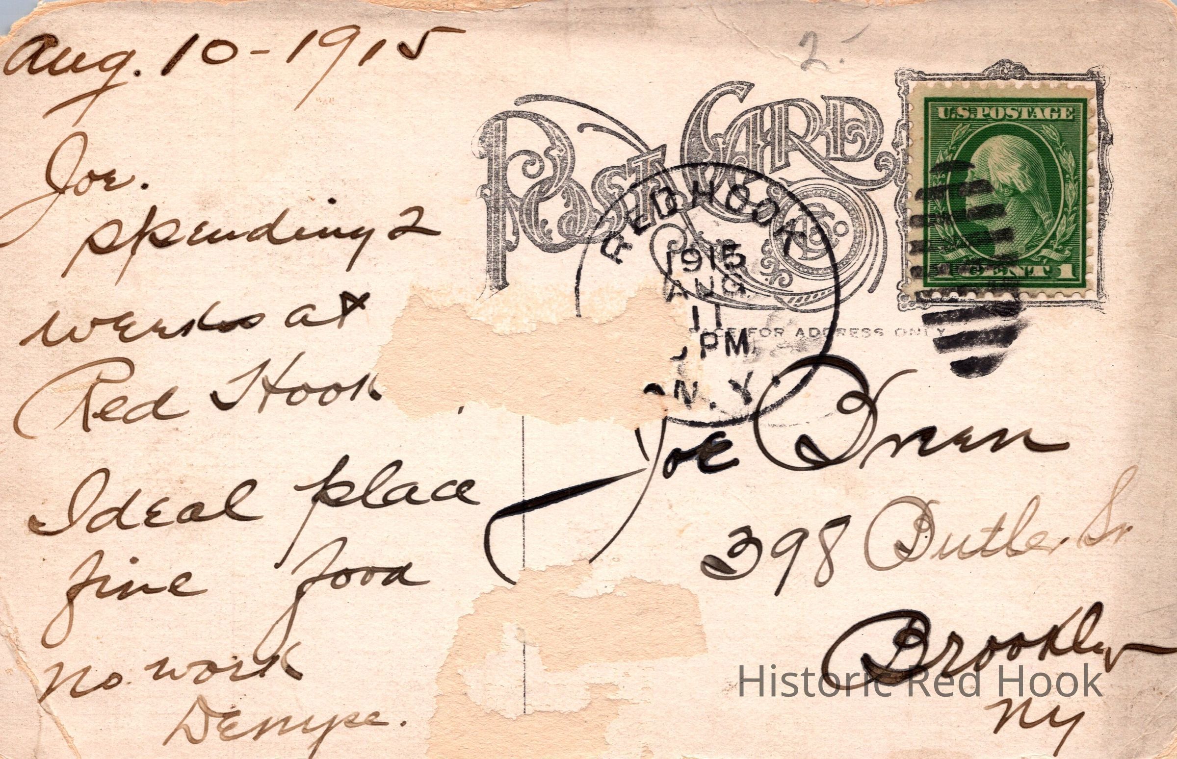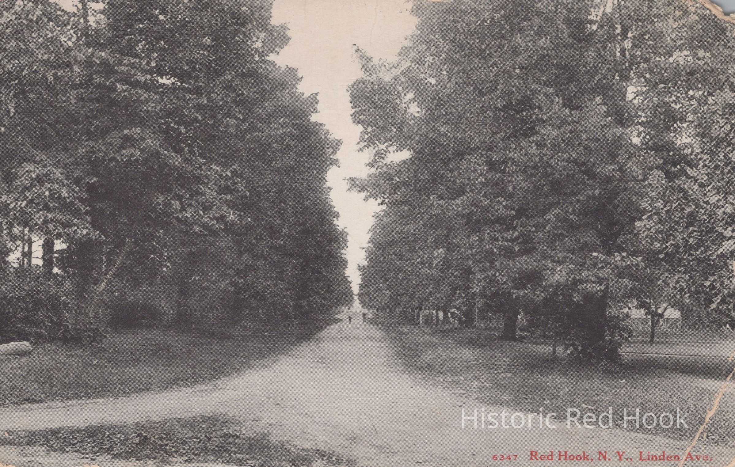 Postcard with view of Linden Avenue looking north, postmarked Aug 11, 1915. Addressed to Joe (illegible last name) in Brooklyn, NY - "spending 2 weeks at Red Hook. Ideal place, fine food, no work" signed "Denyse".Collection