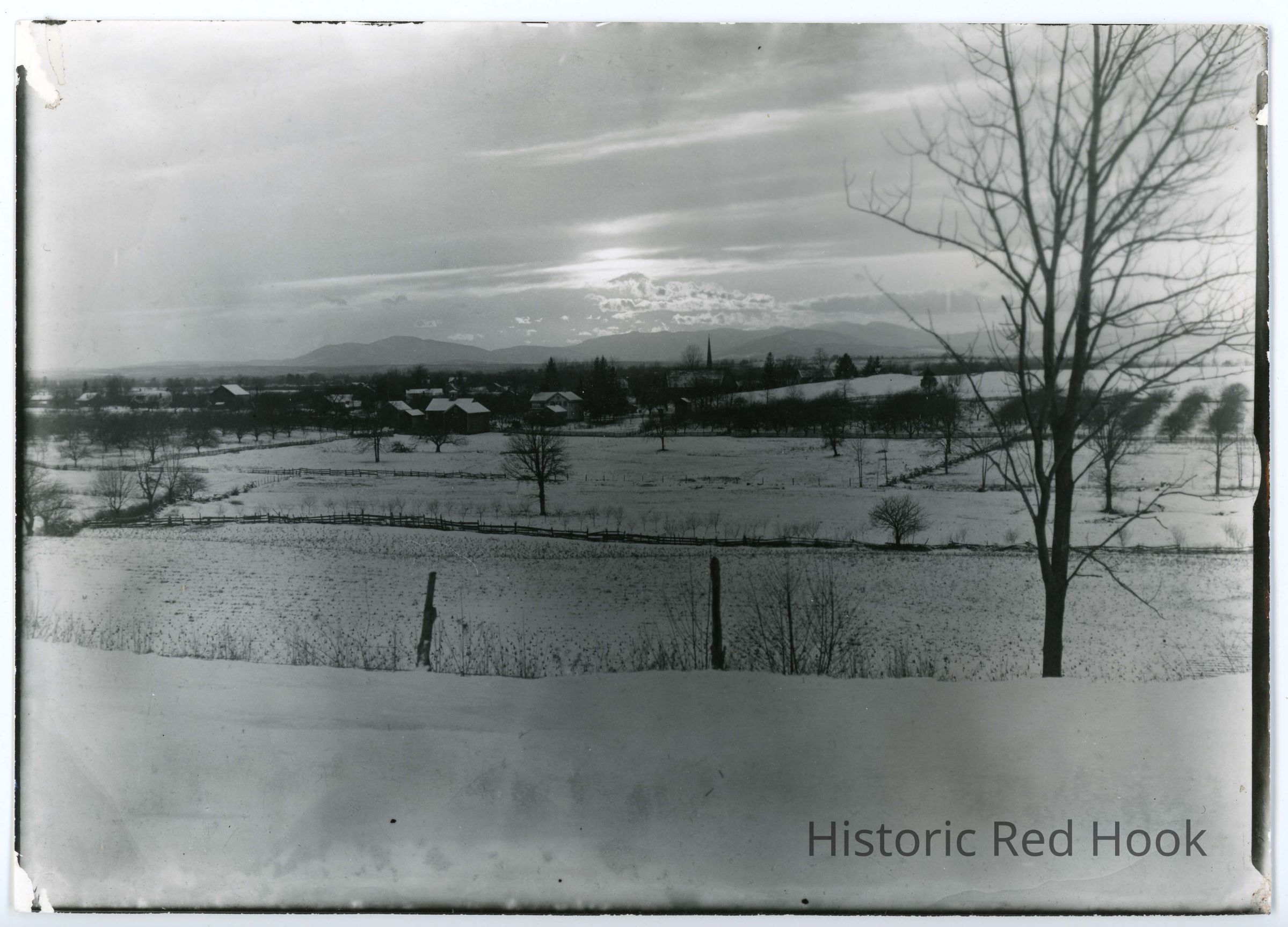 View of the Catskills Winter - Upper Red Hook from Prospect Hill. Glass plate negative taken by W. S. Teator c. 1902. "Left fence post points to George Clum's barn (Barn was formerly W. S. Teator's. Teator's uncle married a Clum.). Right fence post points to Dutch Reformed Church.Collection