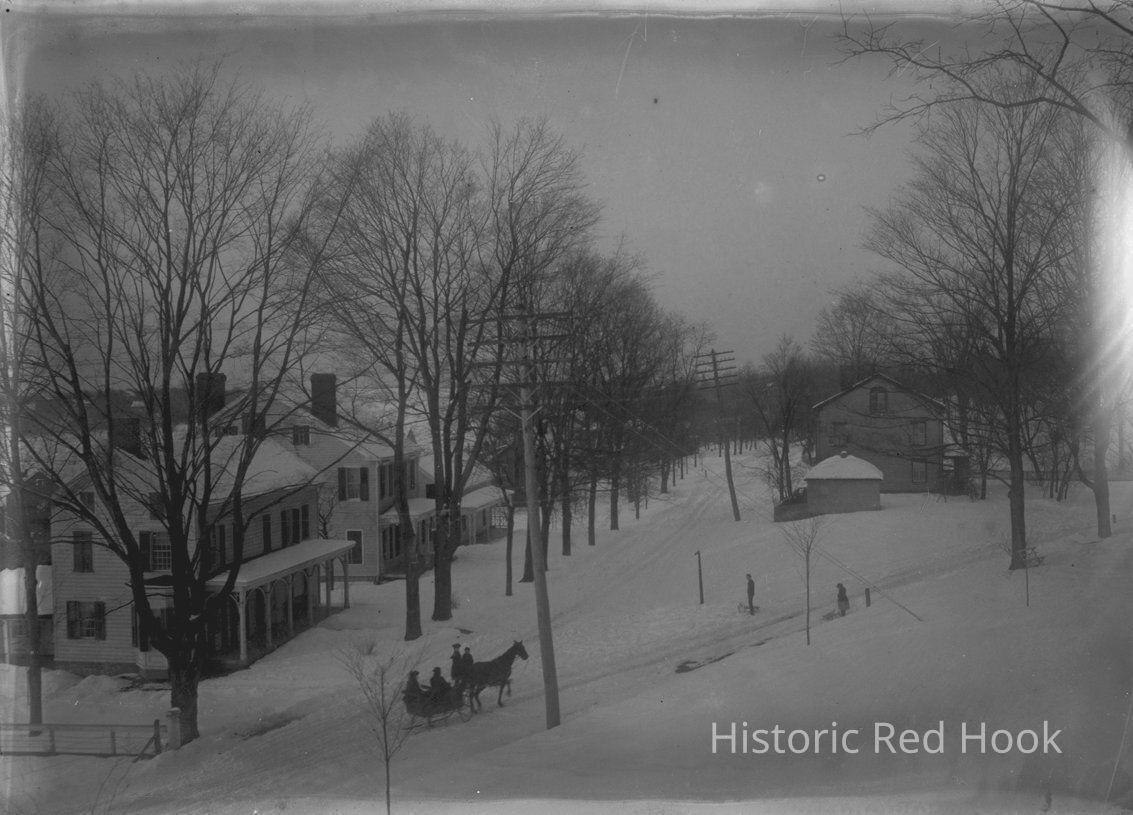 Upper Red Hook, Village Green in the Snow. Horse-drawn carriage in foreground. Gardner House (Vosburgh), Knickerbocker House (Moore), Heermance House on the left and a Hotel on the right.Collection
