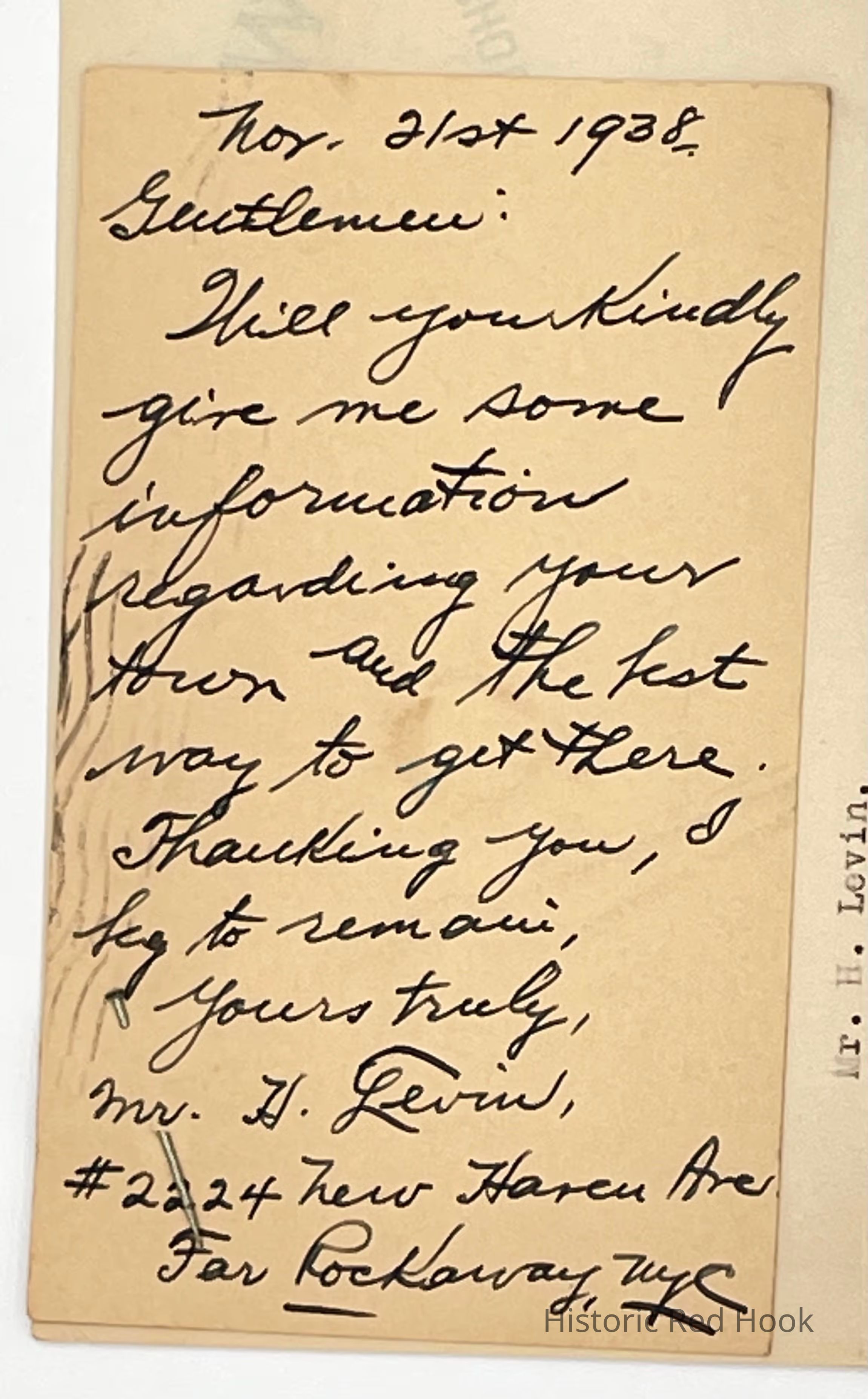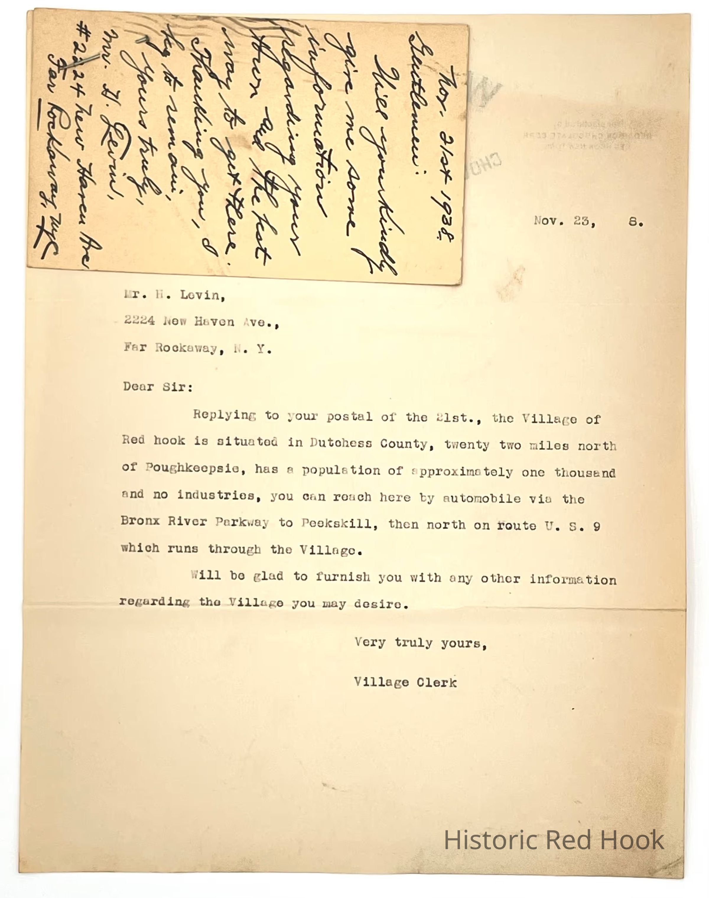 Post card requesting information about Red Hook and the letter of response from the village office.Relationships